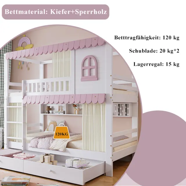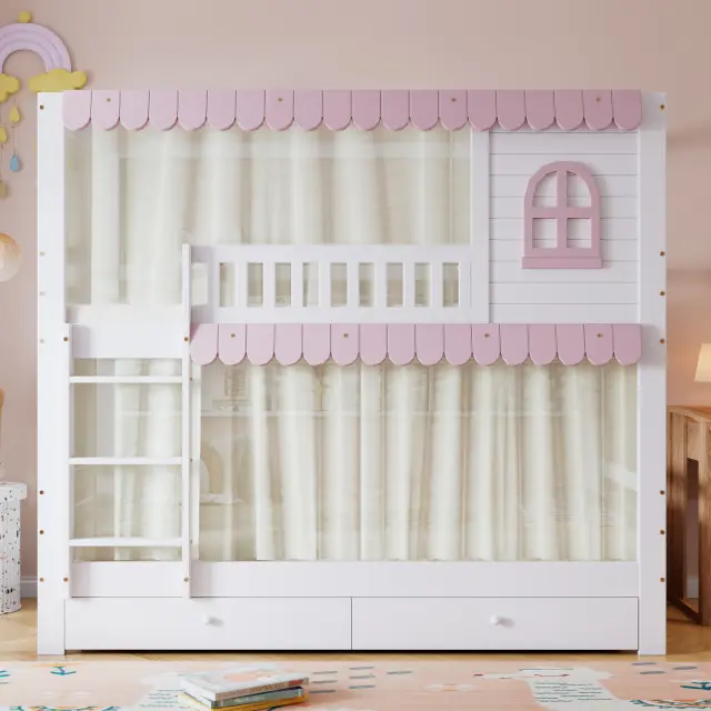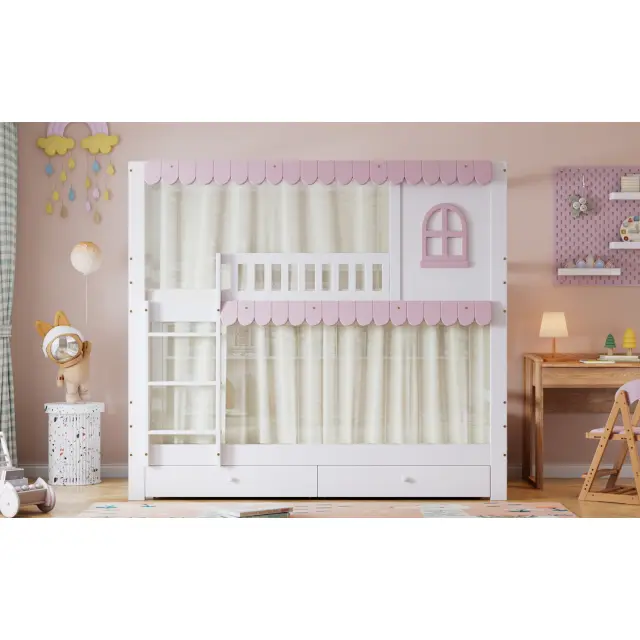 Ta belo-roza pogradna postelja iz bora in MDF-ja ponuja varnost in zabavo z okni, zavesami in varnostnimi ograjami. Ima tudi veliko prostora za shranjevanje in lestev.