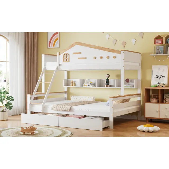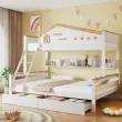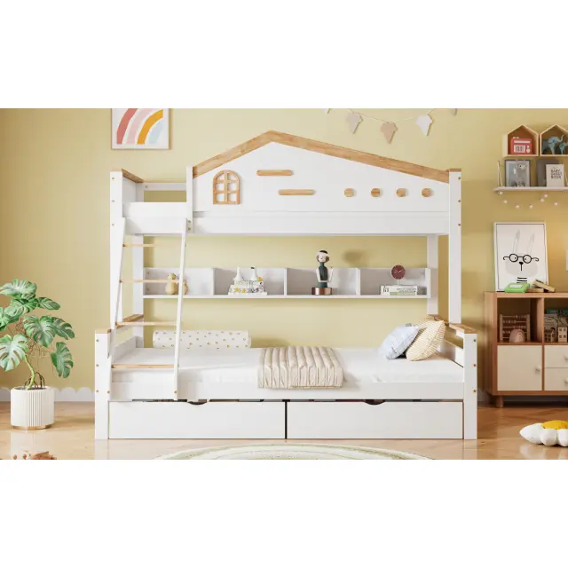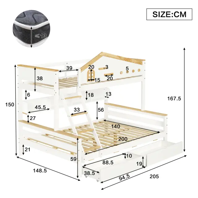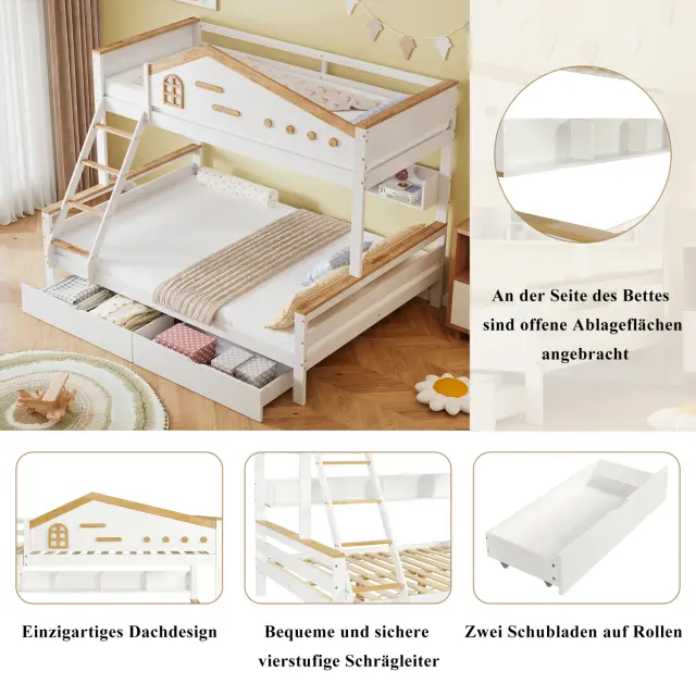 Pogradna postelja z oknom, 2 predala, bor + MDF, bela + naravna, 90x200/140x200 cm
