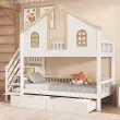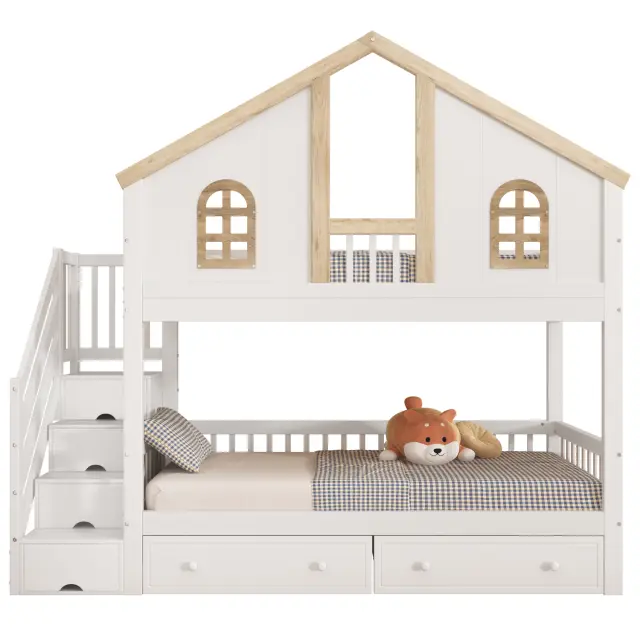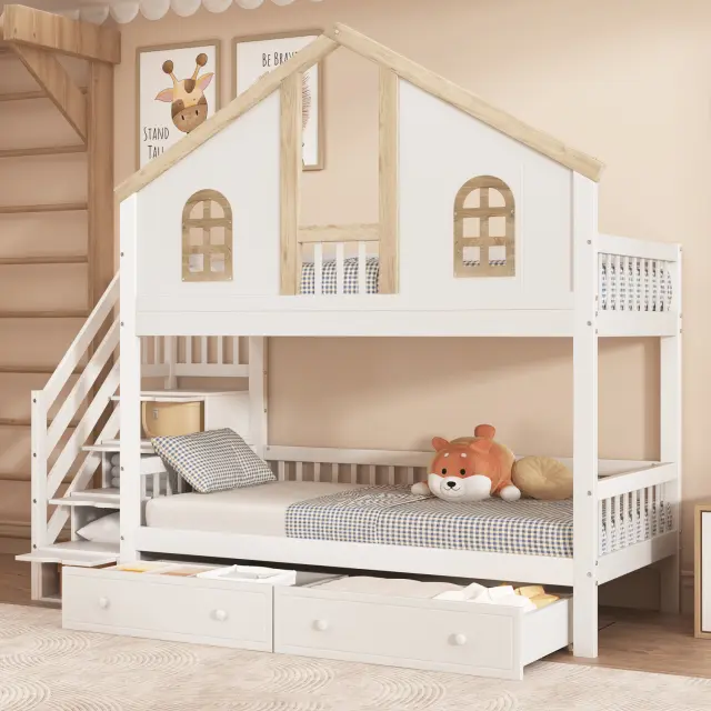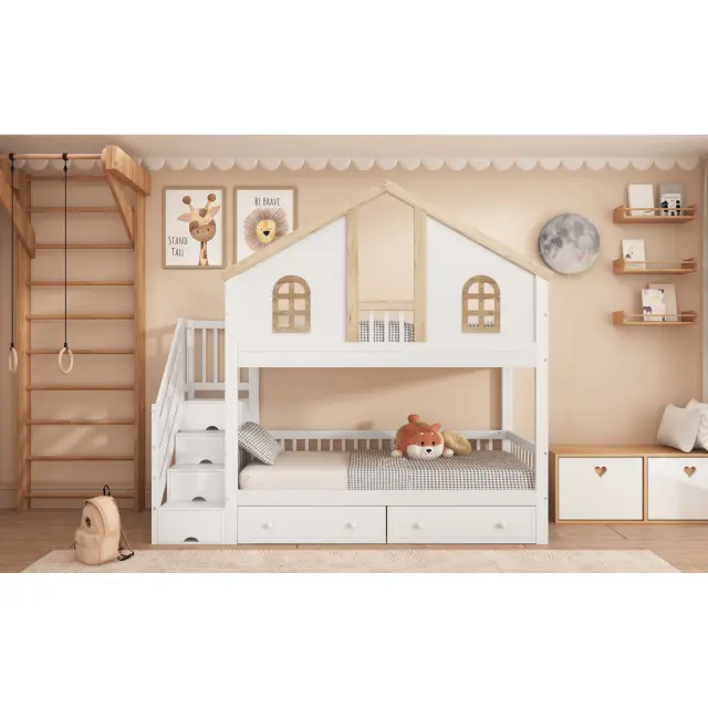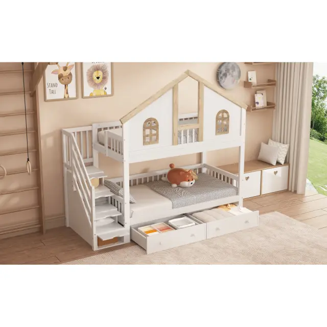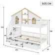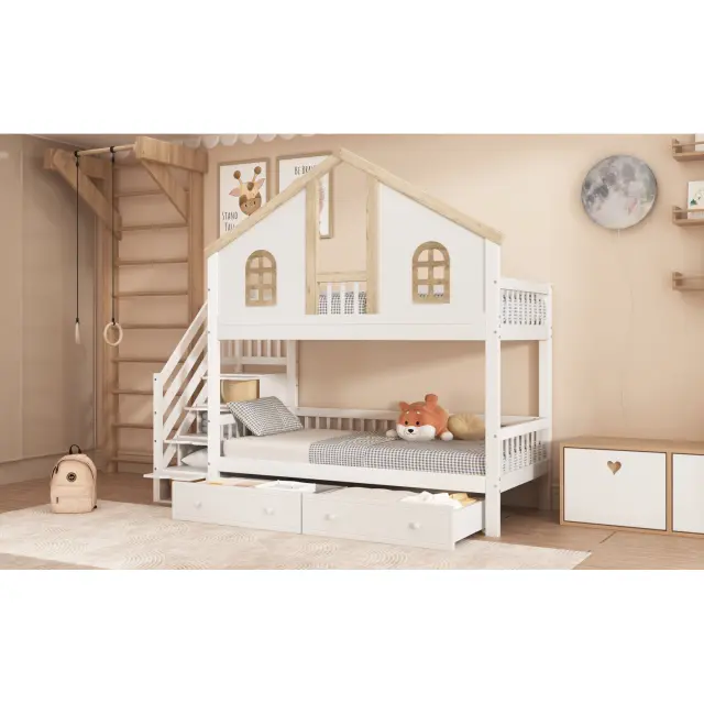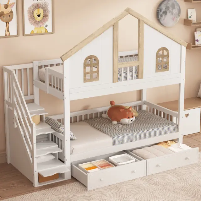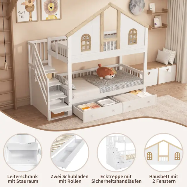 Pogradna postelja z oknom, 2 predala, stopnice s policami, bor + MDF, 90x200 cm