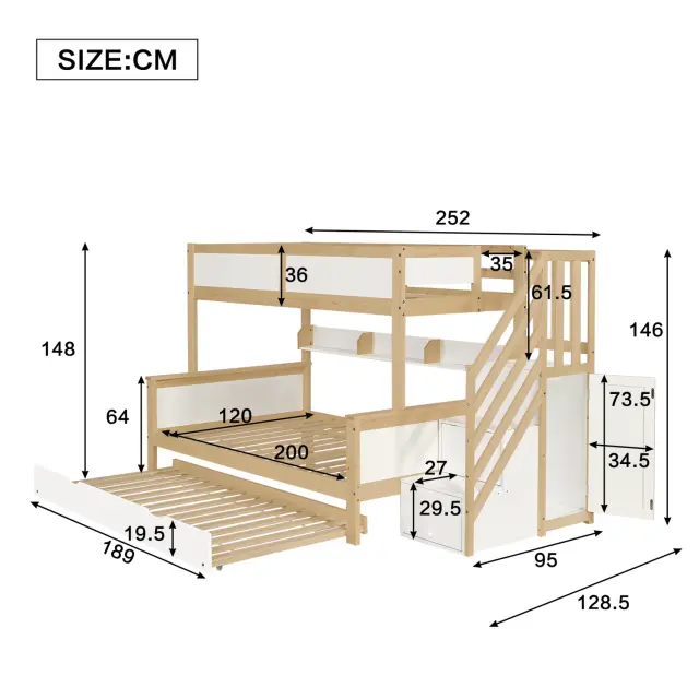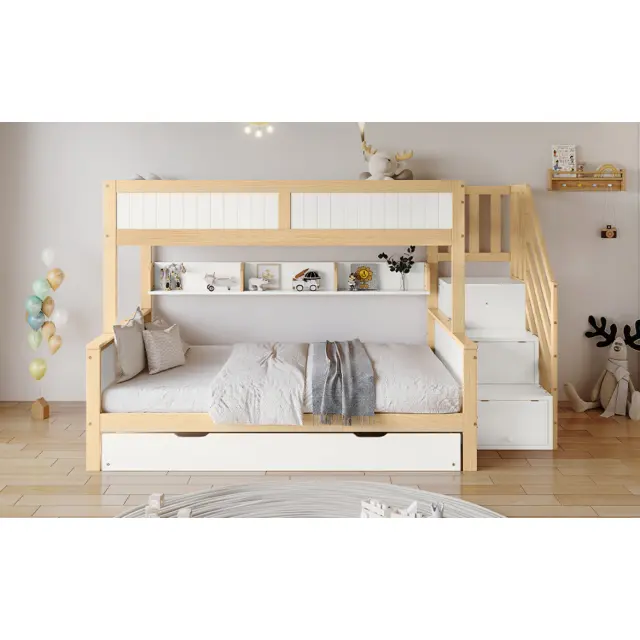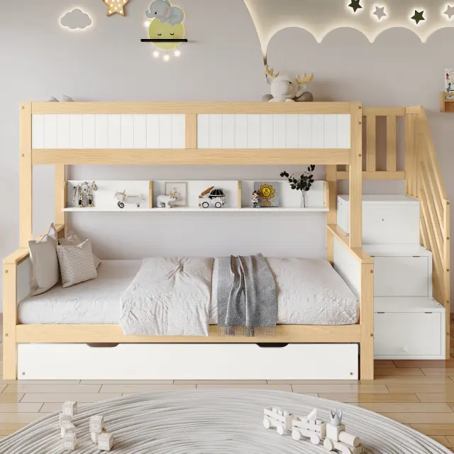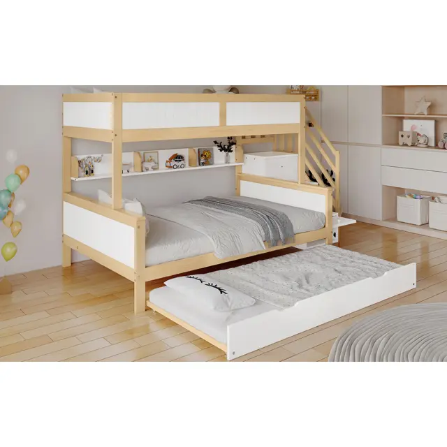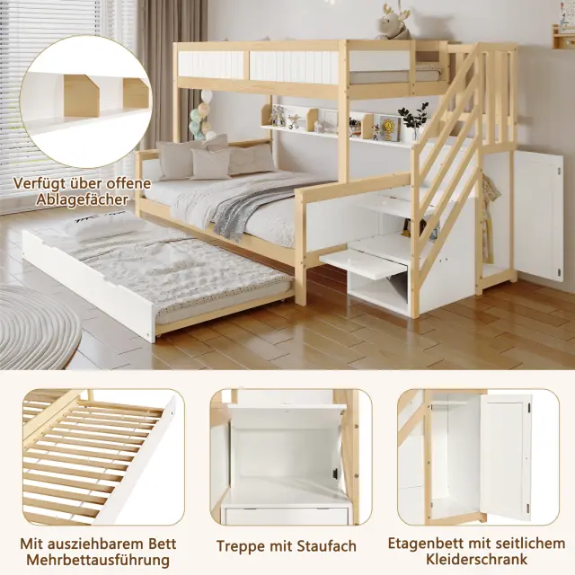 Ta pogradna postelja je izdelana iz belega in naravnega borovega lesa/MDF-ja, ima varnostne ograje in lestev ter izvlečno posteljo za goste. Ponuja veliko prostora za shranjevanje s tremi omaricami na stopnišču in garderobno omaro.