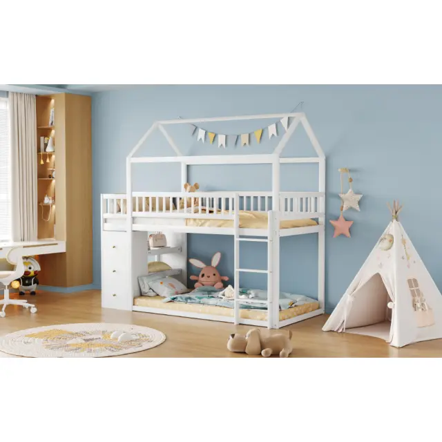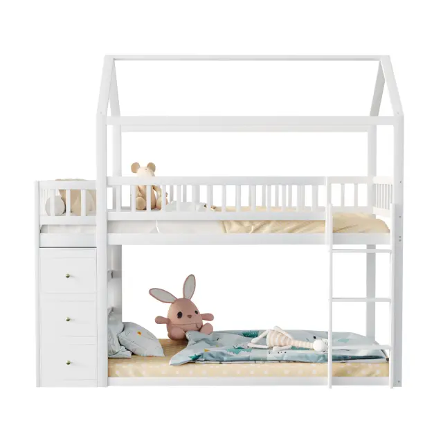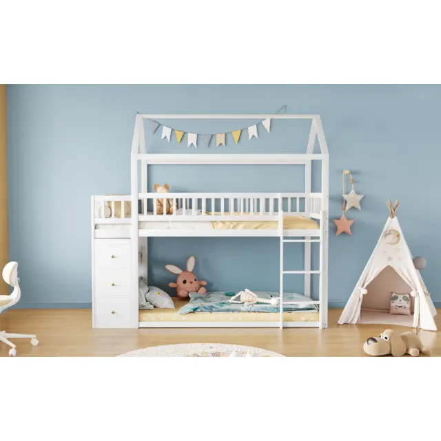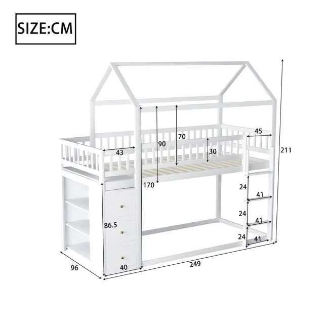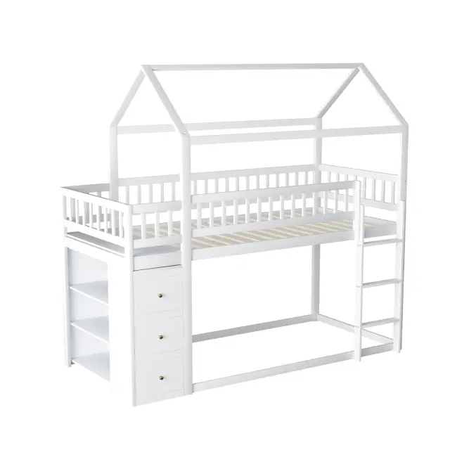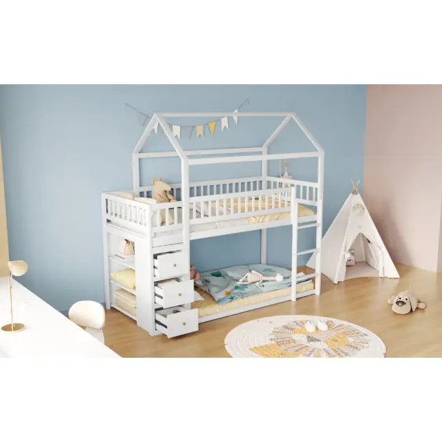 Pogradna postelja za otroke 90x200 cm, oblika hišice, s prostorom za shranjevanje, bela
