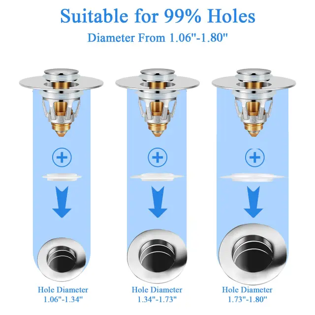 Univerzalna namestitev: Ta pojavni zamašek je zasnovan tako, da se prilega večini standardnih umivalnikov s premerom odtoka od 2,7 cm do 5 cm. Združljiv je z odtoki z mrežo in brez nje.