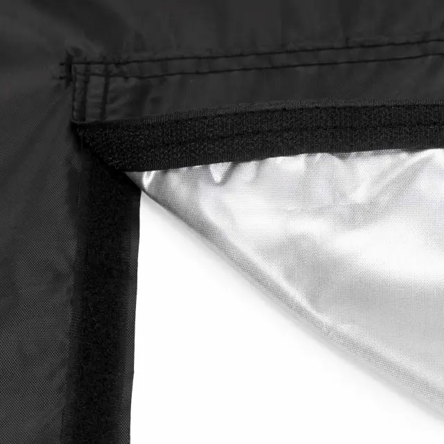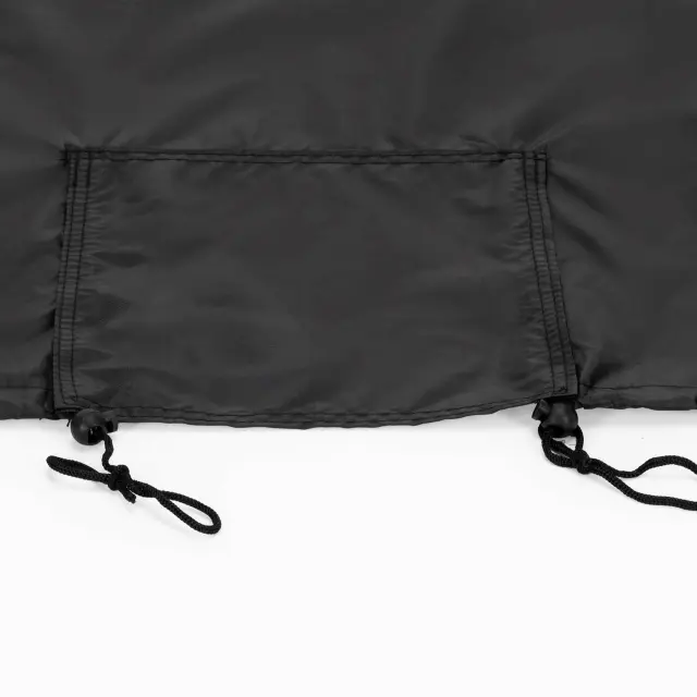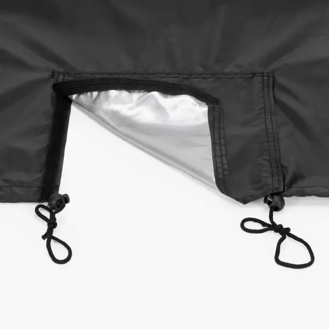 Platneni pokrov je opremljen s funkcionalnimi servisnimi odprtinami. Gornji izrez omogoča prost dostop do pokrova rezervoarja, brez odstranitve celotnega pokrova. Stranska odprtina olajša uporabo pipe in preverjanje ravni vode. Obe lokaciji sta zaščiteni s močnim ježkom, ki ščiti notranjost pred umazanijo. Vodoodporna tkanina učinkovito ščiti posodo pred dežjem in snegom. Črna barva daje celotni zadevi estetski, nevtralni videz, ki se ujema z urejeno okolico. Po koncu sezone lahko pokrovilo enostavno zložite in shranite, saj ne zavzame veliko prostora. To je funkcionalen dodatek, ki podaljšuje življenjsko dobo posode in ji zagotavlja boljšo zaščito skozi celo leto. Prednosti