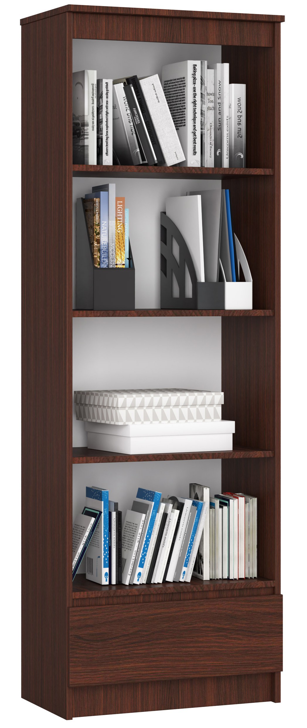 Wenge polica je opremljena s 4 velikimi policami in 1 prostornim predalom. To so zelo funkcionalne rešitve, ki pohištvo naredijo uporabno za različne namene. Odlično bo delovalo kot domača knjižnica v dnevni sobi, kot kos pohištva za učbenike v študentski sobi ali kot element pisarniške opreme. Nič ne preprečuje, da bi polico postavili v hodnik ali predsobo in jo uporabljali za shranjevanje torb, klobukov in šalov.
