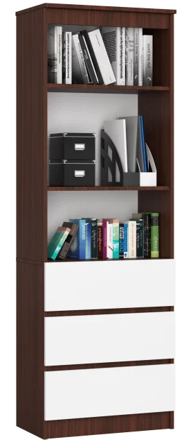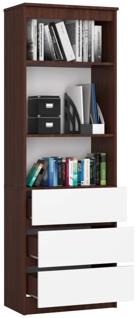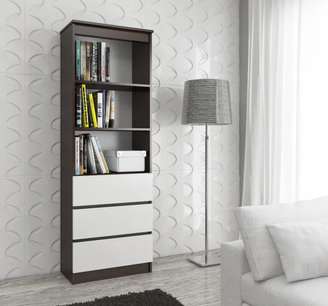 Pisarna polica z telesom v trendovskem odtenku wenge in belimi sprednjimi stranmi je univerzalni kos pohištva, primeren za uporabo tako v profesionalnih prostorih kot v zasebnem domu ali stanovanju. Opremljena s tremi predali in dvema policama z nastavljivo višino, bo polica izjemno udobna in funkcionalna oprema, v katero lahko enostavno shranimo dokumente, knjige, navodila ali druge vrste dodatkov, potrebnih za vsakodnevno delo. Modna kombinacija belih in wenge barv omogoča uporabo v različnih notranjih aranžmajih, tako zasnovanih v modernem kot minimalističnem slogu. Visokokakovostni materiali, uporabljeni pri konstrukciji police, kot so laminirane plošče z robovi, pokritimi z ABS oblogo, dajejo temu pohištvu trajnost in odpornost na obrabo, ki izhaja iz vsakodnevne uporabe. Enostavno podaljšanje predalov omogočajo uporabljeni GTV vodniki z izvlečnim zaklepom. Optimalna velikost omogoča, da se polica postavi tako v majhne kot velike prostore.
