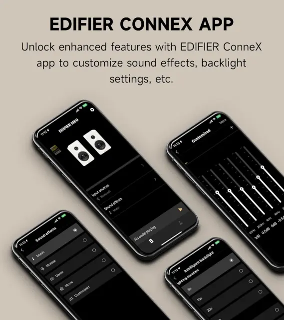 OPTIMIZIRANA IZKUŠNJA POSLUŠANJA – Vključena aluminijasta stojala za zvočnika zmanjšajo odboj zvoka in zagotavljajo čist, naraven zvok pri uporabi na mizi. Enostavna uporaba omogoča preprosto prilagajanje vhodnega vira in glasnosti. Mobilna aplikacija EDIFIER ConneX omogoča še večjo personalizacijo.