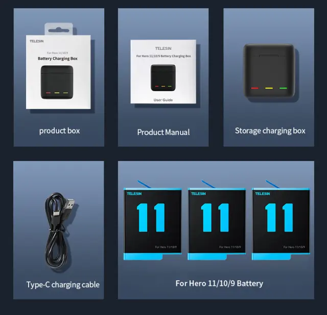 S Telesinom lahko vaša kamera v kratkem času spet deluje. Polnilnik podpira hitro polnjenje 2,4 A. To pomeni, da lahko napolni vse 3 baterije v samo 2,5 urah! Naprava je opremljena z vhodom USB-C. Za priključitev na vir napajanja vam ni treba uporabljati dodatnih adapterjev - uporabite samo priloženi kabel!