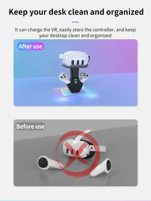 Univerzalna združljivost z VR: Ta polnilna postaja je posebej zasnovana za združljivost s slušalkami Oculus Quest 3 in 4s VR, kar zagotavlja popolno in varno namestitev vaše naprave.