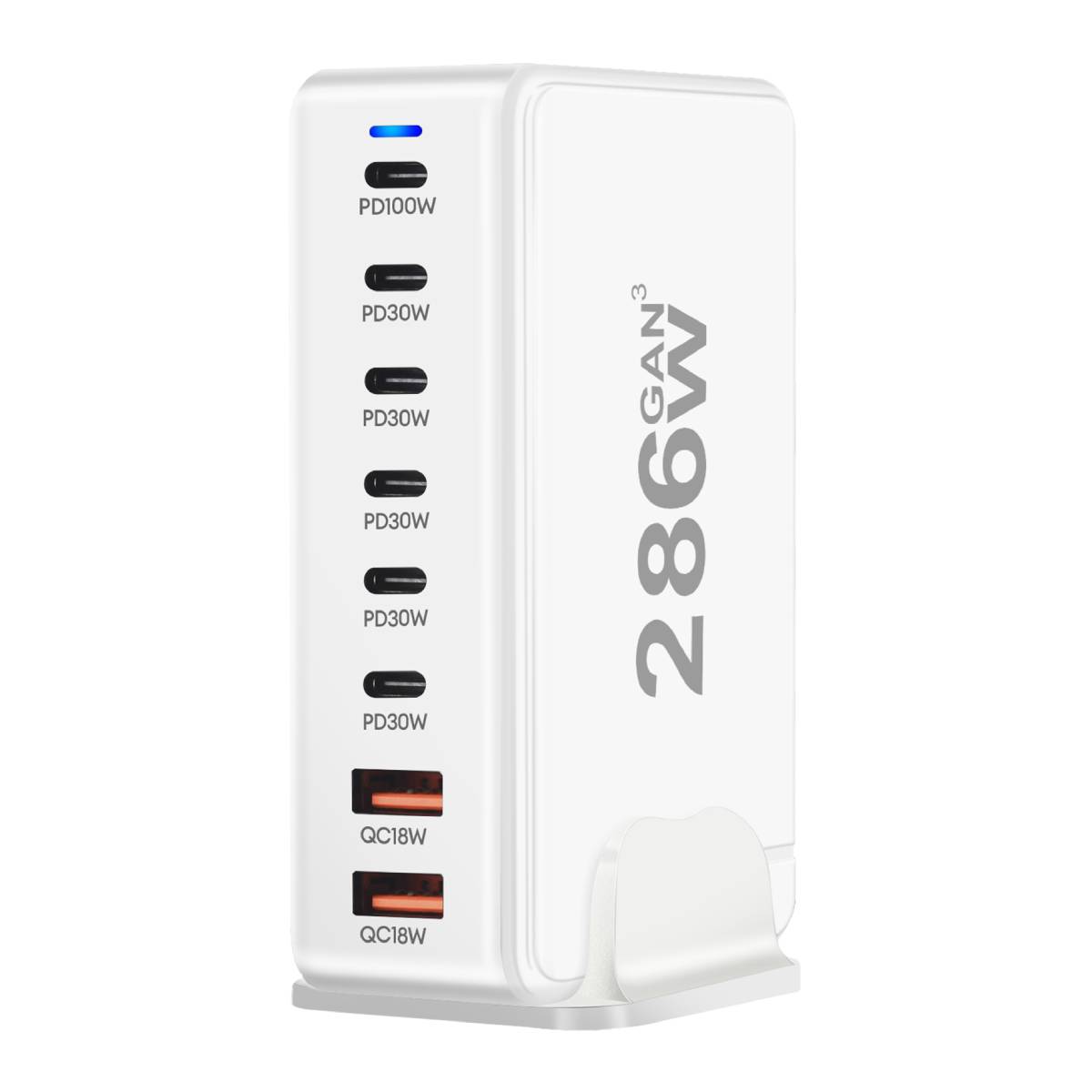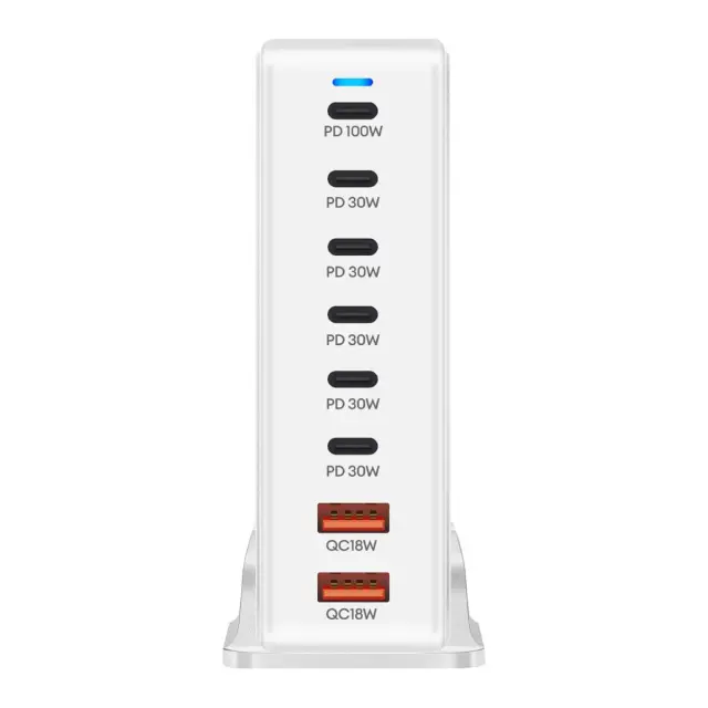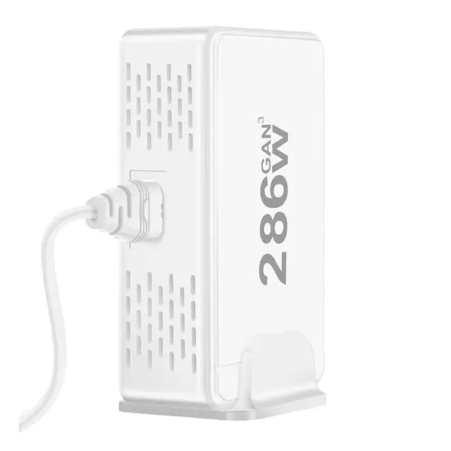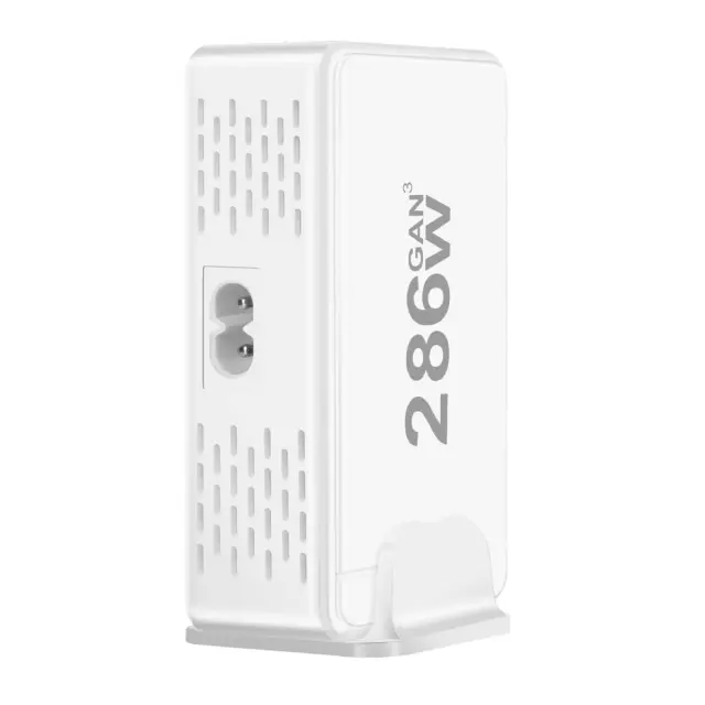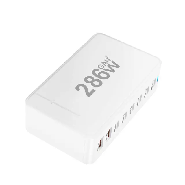 286 W skupne moči za hkratno hitro polnjenje. Tehnologija GaN3 za kompaktnost, učinkovitost in optimizirano odvajanje toplote. Ima 6 priključkov USB-C, združljivih z napajanjem Power Delivery (1x 100W, 5x 30W). Ima tudi 2 x 18W priključka USB-A Quick Charge 3.0 za dodatno opremo ali starejše naprave.