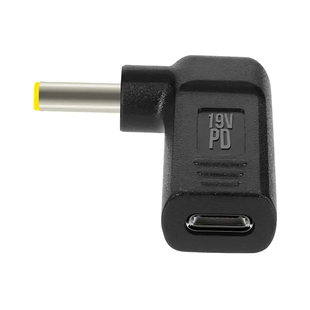 Polnilni adapter USB-C na DC 5,5 x 2,5 mm, pod kotom - crn. Polnilni adapter USB-C na DC 5,5 x 2,5 mm. 5,5 x 2,5 mm kolenasti moški vtic, združljiv z vsemi prenosniki in drugimi napravami, opremljenimi s 5,5 x 2,5 mm polnilnimi vrati DC. Združljiv s kablom USB-C. Žepni dizajn.