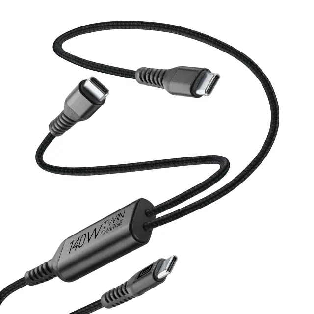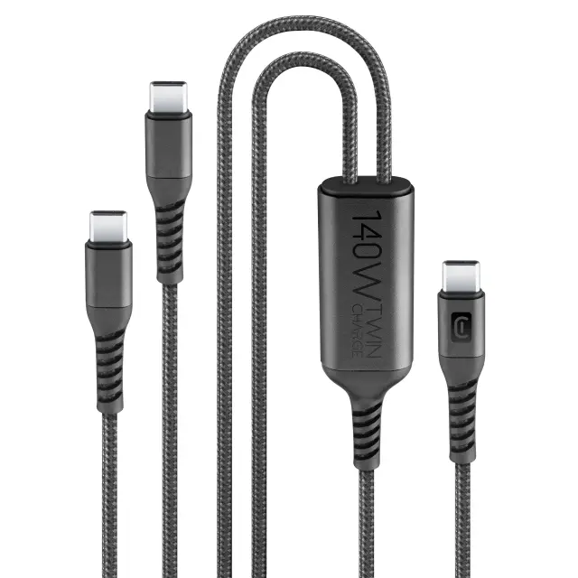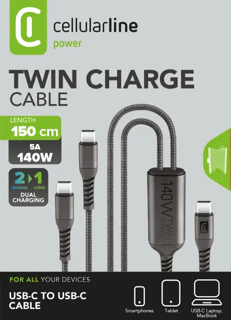 Inovativni Cellularline TWIN USB-C kabel z močjo do 140W. Polnite dve napravi hkrati iz enega vira. Idealno za prenosnike, tablice in telefone. Dolžina 1,5 m.