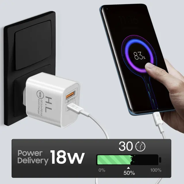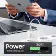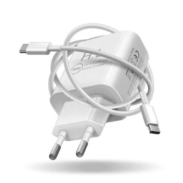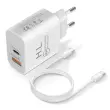 Omrežni polnilnik z dvojnim USB-C USB izhodom. Stenski adapter ima tehnologijo 18 W Power Delivery in Quick Charge 3.0 za hitro polnjenje. Inteligenten, samodejno porazdeli moc polnjenja. Priložen kabel USB-C v USB-C.