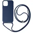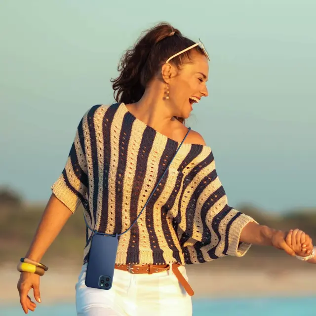 Modra torbica s kablom za iPhone 12 Pro Max. To ohišje iz polikarbonata in silikonskega gela šciti mobilni telefon pred udarci in praskami. Ima nastavljiv pleten najlonski trak za nošenje telefona okoli vratu ali kot naramnico.