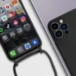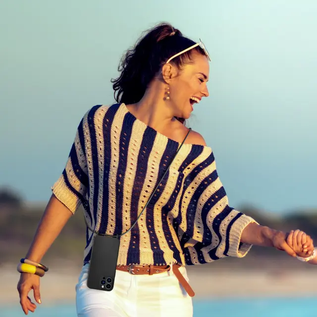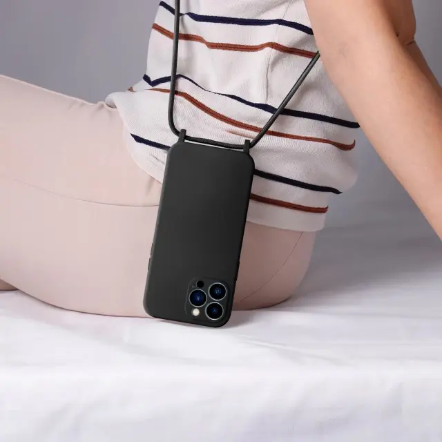 Apple iPhone 13 Pro Max crna torbica s kablom. To ohišje iz polikarbonata in silikonskega gela šciti mobilni telefon pred udarci in praskami. Ima nastavljiv pleten najlonski trak za nošenje telefona okoli vratu ali kot naramnico.
