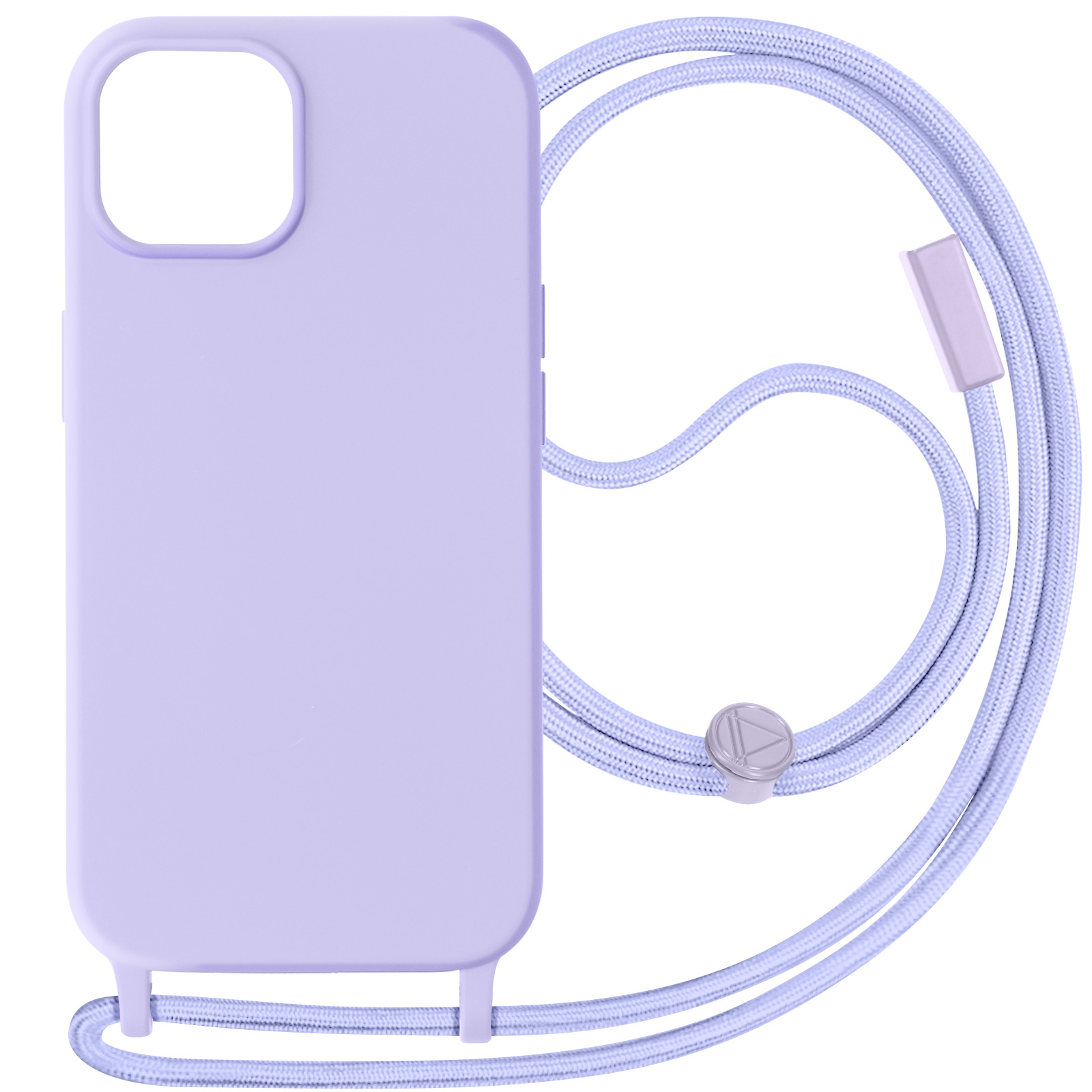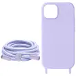 Vijolicen etui Apple iPhone 15 Plus iz serije Corda. Ovitek za iPhone 15 Plus iz polikarbonata in gel silikona. Zašcita za iPhone 15 Plus z 80 cm pletenim najlonskim trakom za nošenje telefona okoli vratu ali kot naramnica.