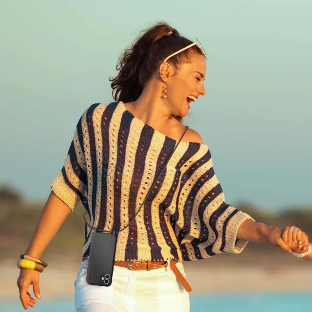 Crna torbica s kablom za iPhone 11. To ohišje iz polikarbonata in silikonskega gela šciti mobilni telefon pred udarci in praskami. Ima nastavljiv 80 cm pleten najlonski trak za nošenje telefona okoli vratu ali kot naramnico.