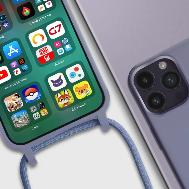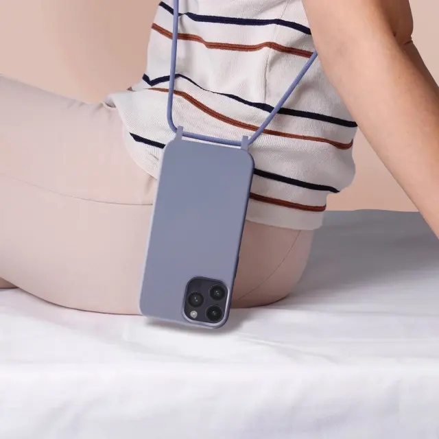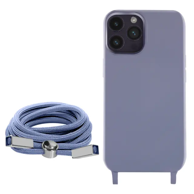 Vijolicna torbica za iPhone 14 Pro. To ohišje iz polikarbonata in silikonskega gela šciti mobilni telefon pred udarci in praskami. Ima nastavljiv 80 cm pleten najlonski trak za nošenje telefona okoli vratu ali kot naramnico.
