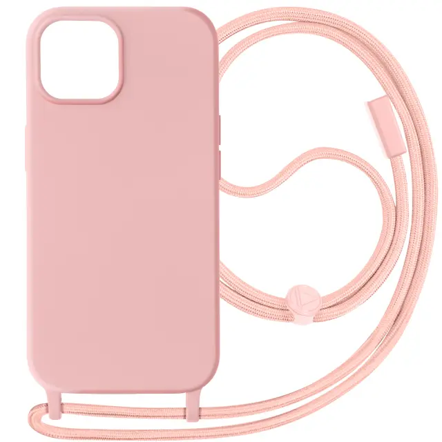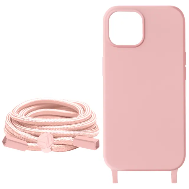 Apple iPhone 15 Plus roza ovitek s vrvico iz serije Corda. Ovitek za iPhone 15 Plus iz polikarbonata in gel silikona. Zašcita za iPhone 15 Plus z 80 cm pletenim najlonskim trakom za nošenje vašega mobilnega telefona okoli vratu ali kot naramnica.