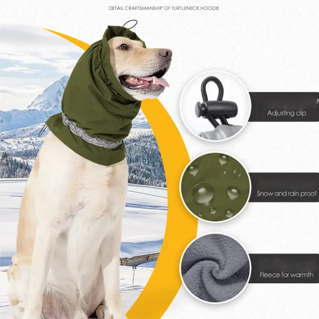 Vodoodporna in topla: Ta pasja kapuca je narejena iz vodoodporne tkanine, ki ohranja glavo in ušesa vašega psa suha in udobna v dežju ali snegu. Notranja podloga iz flisa zagotavlja dodatno toploto v hladnih dneh.