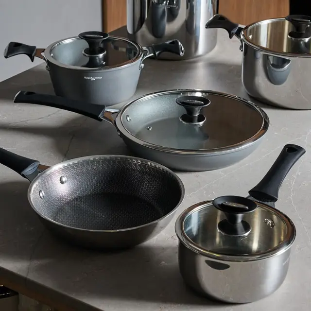 Ponev Luxury Design izstopa s svojim klasičnim, elegantnim in brezčasnim videzom. Opremljena je s prevleko proti prijemanju Stone Ultraresistant (brez PFOA in niklja) s posebno teksturo, ki spominja na satje čebel. Njeno troslojno jekleno ohišje z aluminijastim jedrom (jeklo 18/10, aluminij, jeklo 18/0) enakomerno porazdeli toploto od dna do sten ter zagotavlja izjemno odpornost proti obrabi, praskam in visokim temperaturam. Ponev je primerna za vse vrste kuhalnih površin, vključno z indukcijo. Patentiran silikonski ročaj omogoča varno uporabo brez nevarnosti opeklin. Ponev lahko uporabljate tudi v pečici do 220 °C. Primerna je za pomivanje v pomivalnem stroju, vendar za daljšo življenjsko dobo prevleke priporočamo ročno pomivanje.