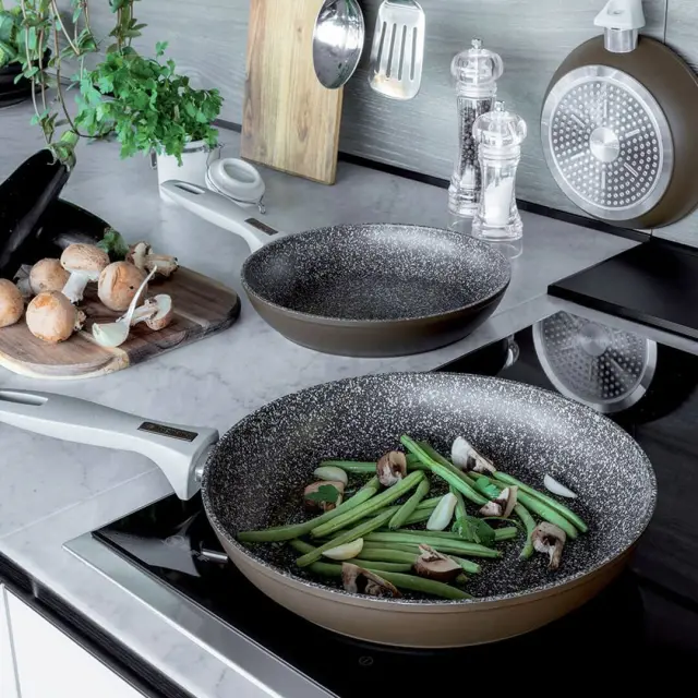 Ponev Tognana Pearbrown Stone z enim ročajem je izdelana iz kovanega aluminija z inovativno štiri slojno marmorizirano notranjo prevleko ojačano z minerali (brez PFOA, niklja), ki materialu omogoča dolgotrajno obstojnost, odpornost pred obrabo in prijemanjem hrane. Kuhanje v takšni ponvi je enostavno, hrana pa se tudi brez dodajanja maščob ne prijema. Dno se ne deformira in enakomerno porazdeli toploto po celotni površini. Ponev je primerna za kuhanje na vseh kuhalnih površinah, vključno z indukcijo. Rjava zunanjost in rjavkasta notranja prevleka je dopolnjena s sivim mehkim ročajem (Soft-Touch) z reliefno gravuro, ki preprečuje drsenje in hkrati daje čvrst oprijem. Premer ponve meri 20 cm. Primerna je za pomivanje v pomivalnem stroju. NAMIG: Dopolnite jo s pokrovom Pearlbrown.