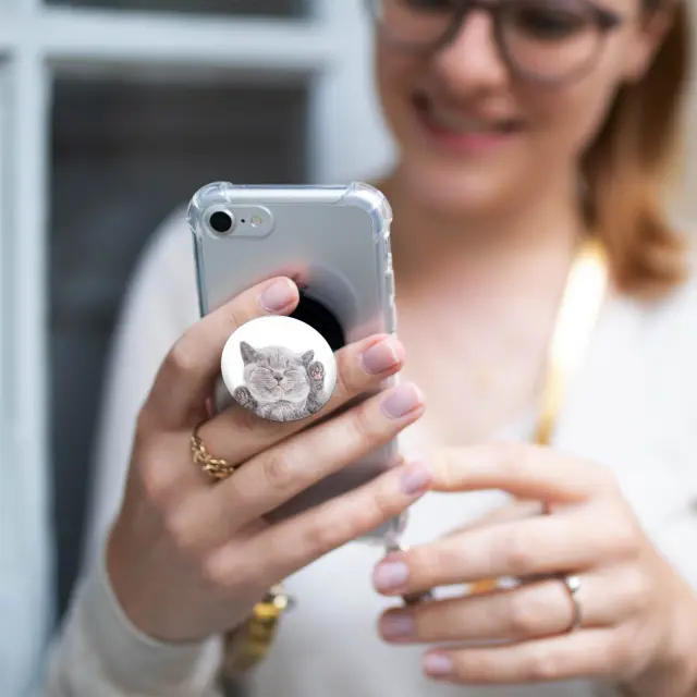Oblikoval ga je PopSockets in je idealen za prilagoditev vašega pametnega telefona ali etuija. Estetika: Zahvaljujoč gravuri ljubke mačke prinaša stran zabave in prijetnosti. Popolna uporabnost: popolnoma varno boste lahko pošiljali besedilna sporočila, snemali selfije in video posnetke. Praktična in uporabna podpora za vodoravni ogled videoposnetkov.