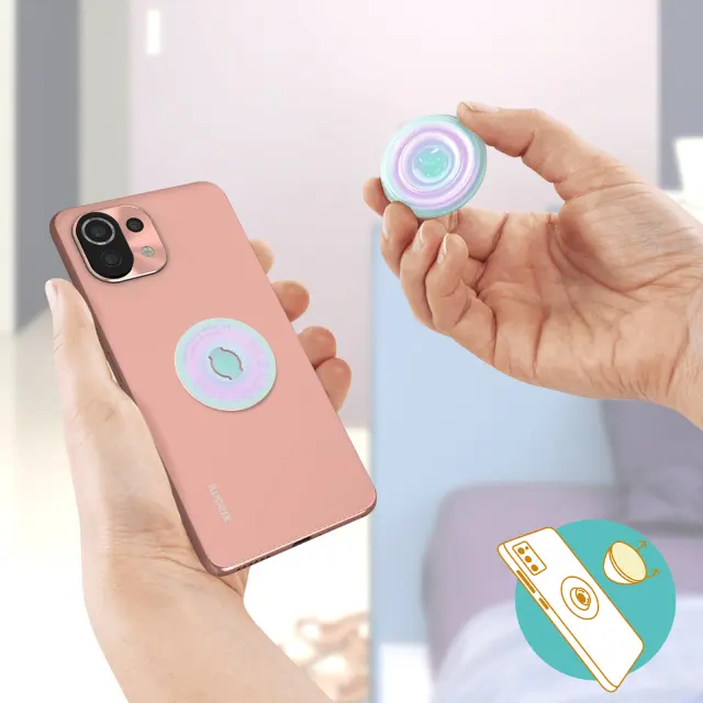 Oblikoval ga je PopSockets in je idealen za prilagoditev vašega pametnega telefona ali etuija. Prelivajoča se oblika: vašemu telefonu doda slog, saj lahko spreminja barvo glede na osvetlitev. Popolna uporabnost: popolnoma varno boste lahko pošiljali besedilna sporočila, snemali selfije in video posnetke. Praktična in uporabna podpora za vodoravni ogled videoposnetkov.