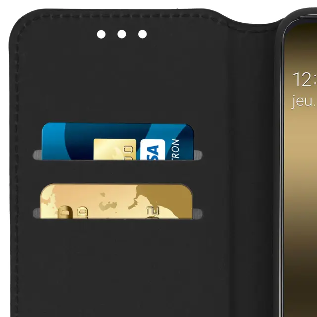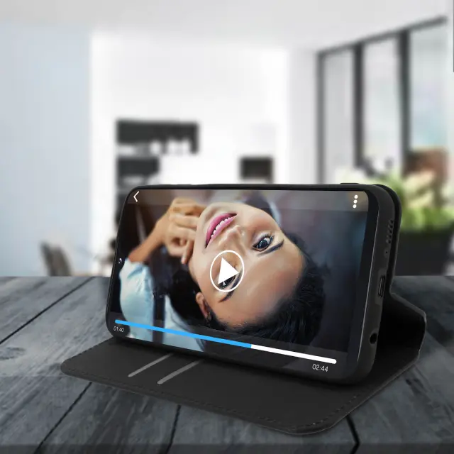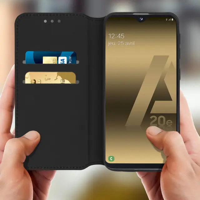 Folio Cover, posebej zasnovan za Samsung Galaxy A20e. Ekološko usnje gladkega videza in šivanega zaključka. 2 predala za kartice v podlogi z zavihkom. Funkcija vodoravnega stojala za udobno uživanje v videoposnetkih/fotografijah.
