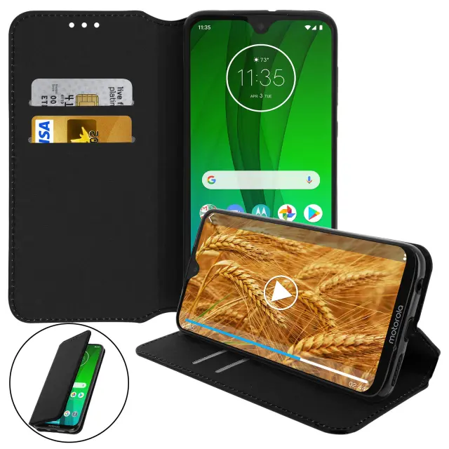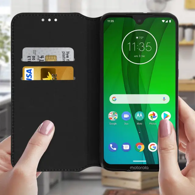 Folio Cover zasnovan za Motorola Moto G7 in G7 Plus. Ekološko usnje gladkega videza in šivanega zaključka. 2 predala za kartice v podlogi z zavihkom. Funkcija vodoravnega stojala za udobno uživanje v videoposnetkih/fotografijah.