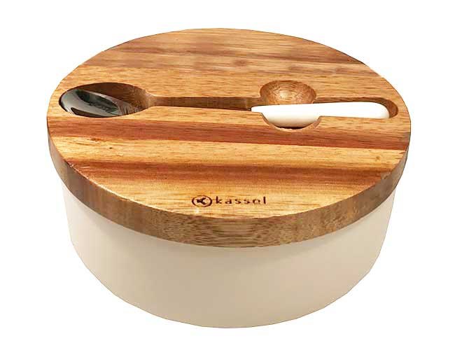 Porcelanasta sladkornica v beli barvi s pokrovom iz akacijevega lesa. V kompletu je žlica s porcelanastim ročajem.