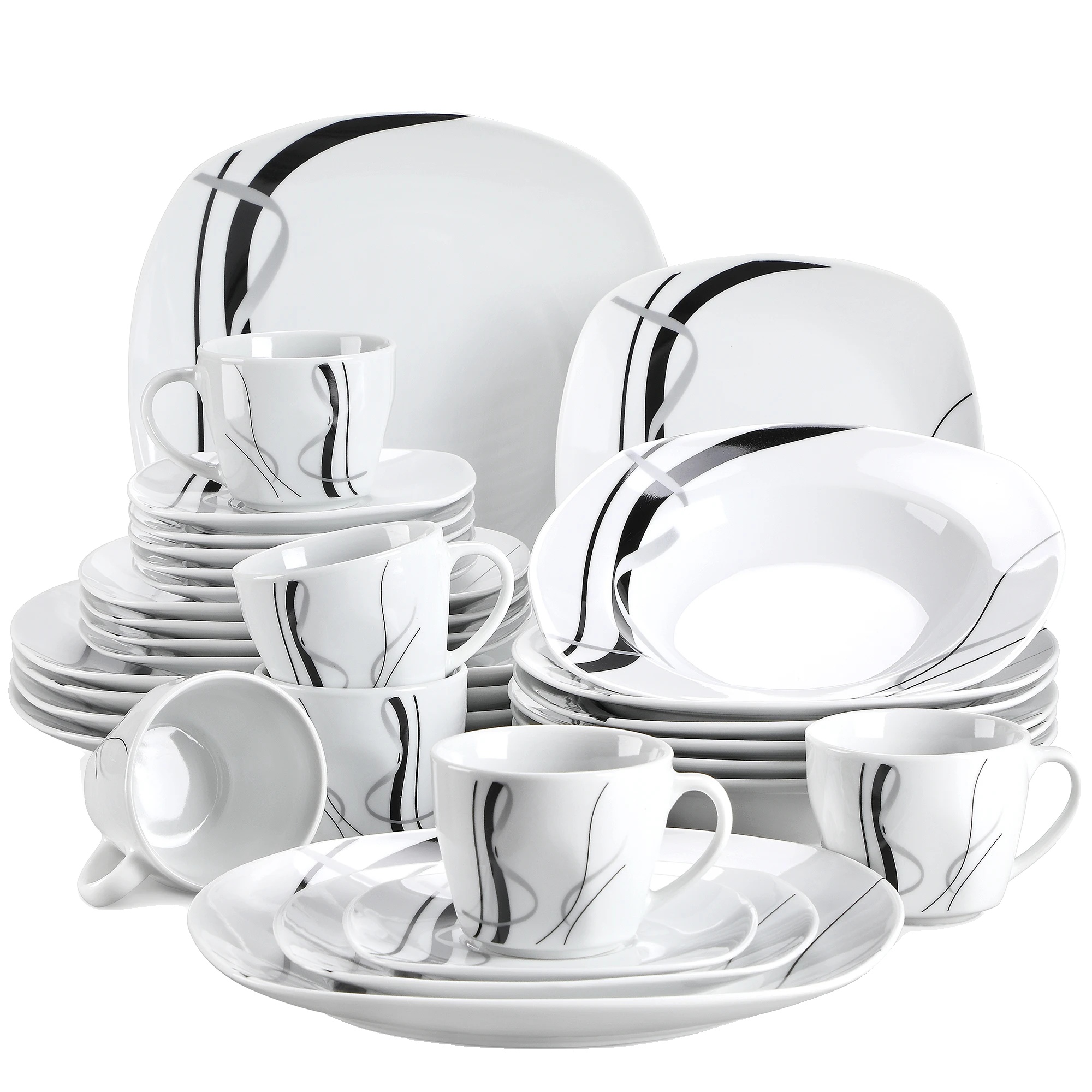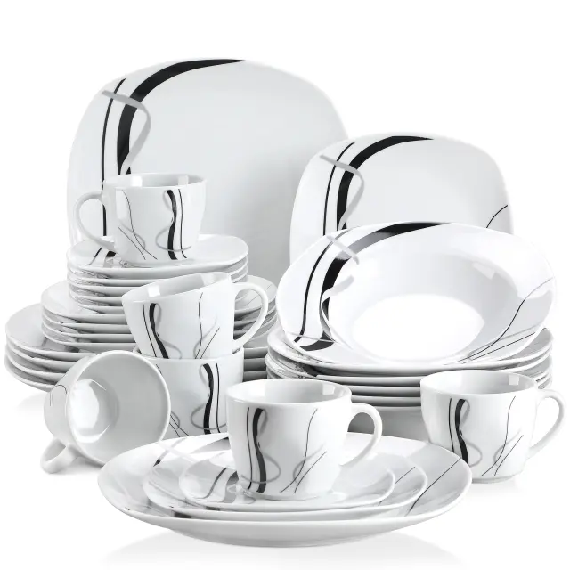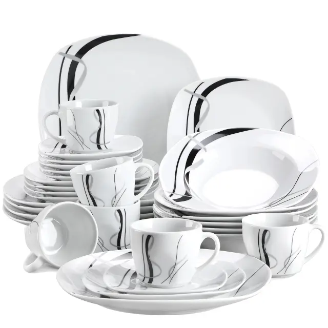 Porcelanski set jedilnega pribora, eleganten dizajn črne linije, okolju prijazen material, 30-delni