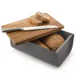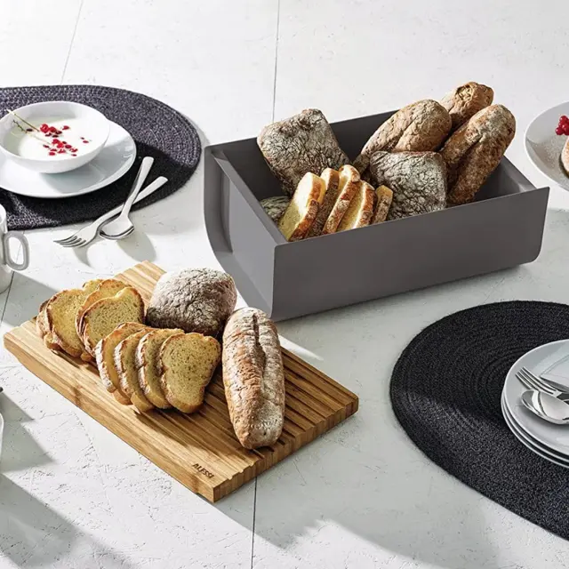 Posoda za kruh Mattina z odstranljivim pokrovom, ki služi tudi kot deska za rezanje, je strukturirana tako, da se drobtine ujamejo in tako ohranijo čist kuhinjski pult ali jedilno mizo. Pokrov lahko uporabite tudi kot pladenj za serviranje narezka ali zajtrka. Za blagovno znamko Alessi je posodo zasnoval oblikovalski trio Big Game. Izdelana je iz kakovostnega jekla, pokrov pa iz bambusovega lesa prebarvanega z epoksi smolo. Zaradi moderno elegantnega videza in nevtralne temno sive barve v kombinaciji z lesom se bo odlično podala v vsak dom. NAMIG: Kombinirajte jo z drugimi izdelki iz iste linije Alessi Mattina.