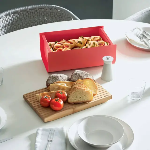 Posoda za kruh Mattina z odstranljivim pokrovom, ki služi tudi kot deska za rezanje, je strukturirana tako, da se drobtine ujamejo in tako ohranijo čist kuhinjski pult ali jedilno mizo. Pokrov lahko uporabite tudi kot pladenj za serviranje narezka ali zajtrka. Za blagovno znamko Alessi je posodo zasnoval oblikovalski trio Big Game. Izdelana je iz kakovostnega jekla, pokrov pa iz bambusovega lesa prebarvanega z epoksi smolo. Zaradi moderno elegantnega videza in nevtralne temno sive barve v kombinaciji z lesom se bo odlično podala v vsak dom. NAMIG: Kombinirajte jo z drugimi izdelki iz iste linije Alessi Mattina.