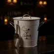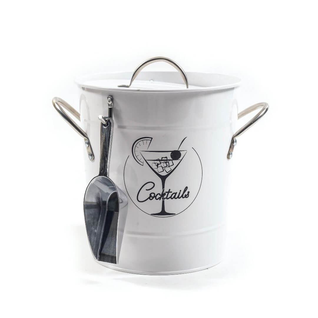 Bela kovinska posoda za led z notranjim plastičnim vedrom za izolacijo je popoln dodatek za postrežbo hladnih pijač na zabavah ali dogodkih. S svojim elegantnim dizajnom, ki vključuje ilustracijo koktajla in napis "Cocktails", ta posoda ne le dobro opravlja svojo funkcijo, ampak tudi lepo dopolni izgled vaše barske opreme. Poleg je priložena praktična kovinska lopatka oz. vevnica za enostavno zajemanje ledu. Ni primerno za pomivanje v pomivalnem stroju