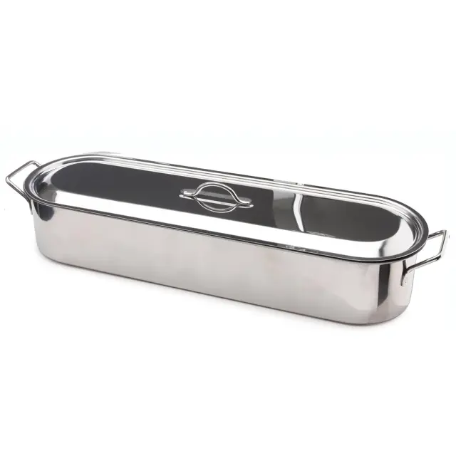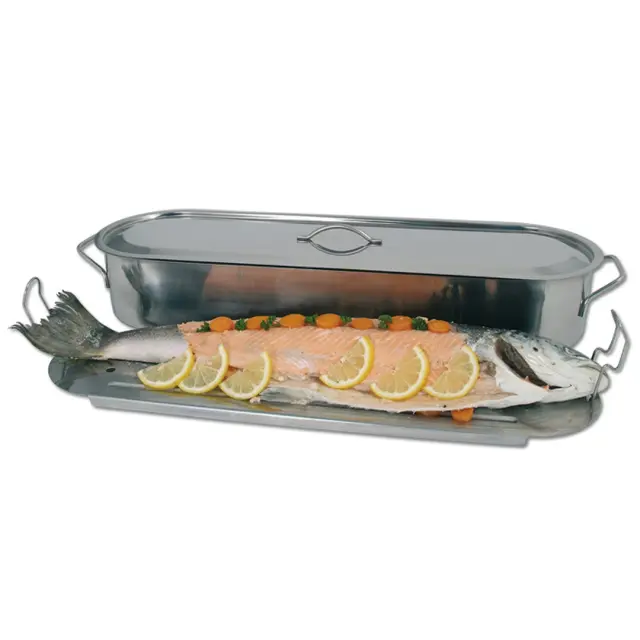 Baumale posoda za kuhanje rib na pari/poširanje ima velikodušno notranjo dolžino 60 cm in širino 17 cm, kar pomeni, da boste v njej zlahka pripravili celo ribo ali pa v njej poparili dolge šparglje in por ter skuhali sladke ali slane štruklje. Posoda vsebuje vložek oz. mrežo, na katero lahko položite ribe, kot so losos, ščuka ali brancin, kar olajša njihovo pripravo, ne da bi pri tem poškodovali mehko meso. Posoda je idealna tudi za kuhanje štrukljev, ki jih s pomočjo perforirane rešetke enostavno vzamete iz posode in odcedite. Izdelana je iz kakovostnega poliranega nerjavečega jekla in primerna za uporabo na vseh kuhalnih površinah (steklokeramika, halogen, plin, elektrika, indukcija ). Posoda je opremljena s pokrovom in z dvema ročajema iz nerjavečega jekla, ki sta trdno zvarjena. Po uporabi jo lahko pomijete v pomivalnem stroju.