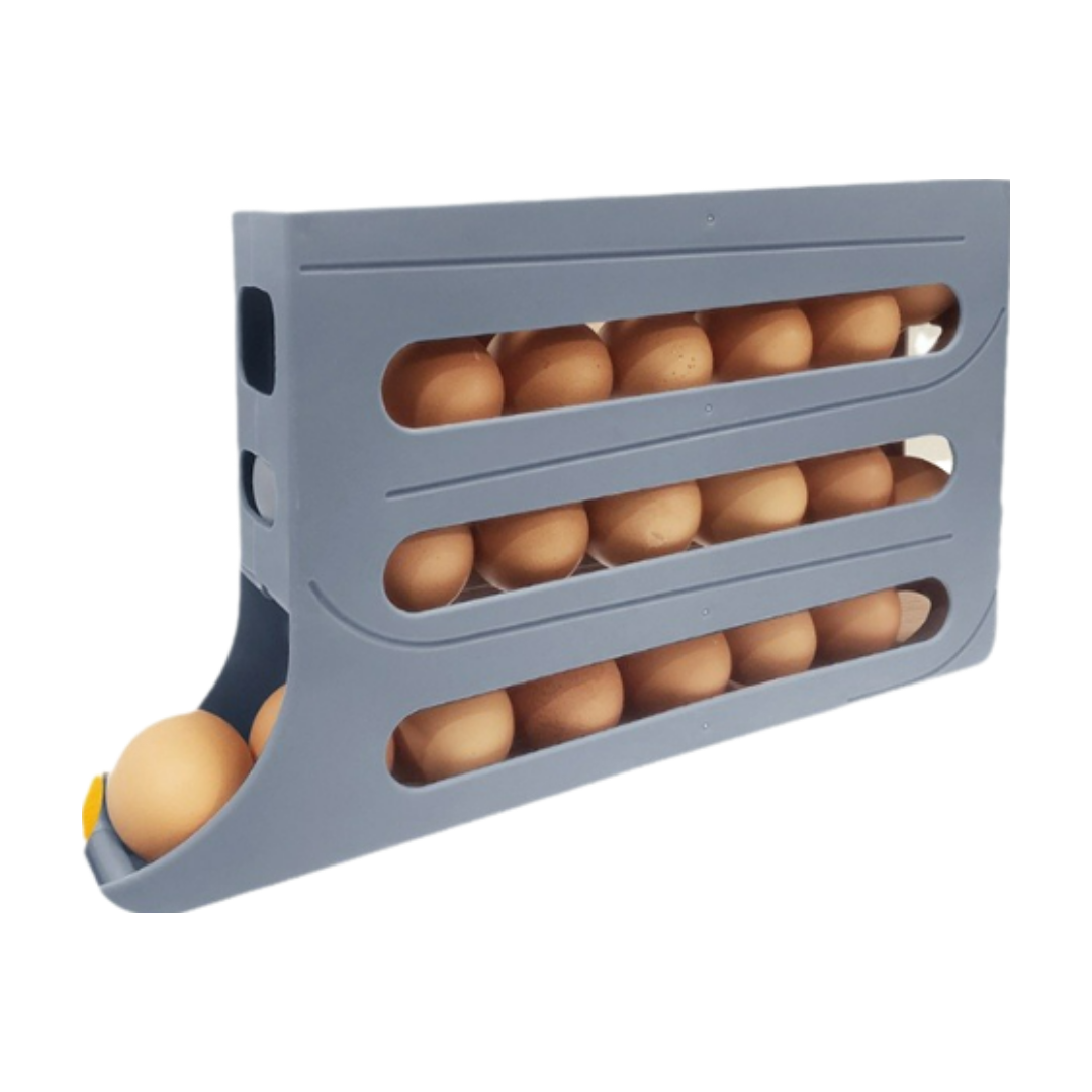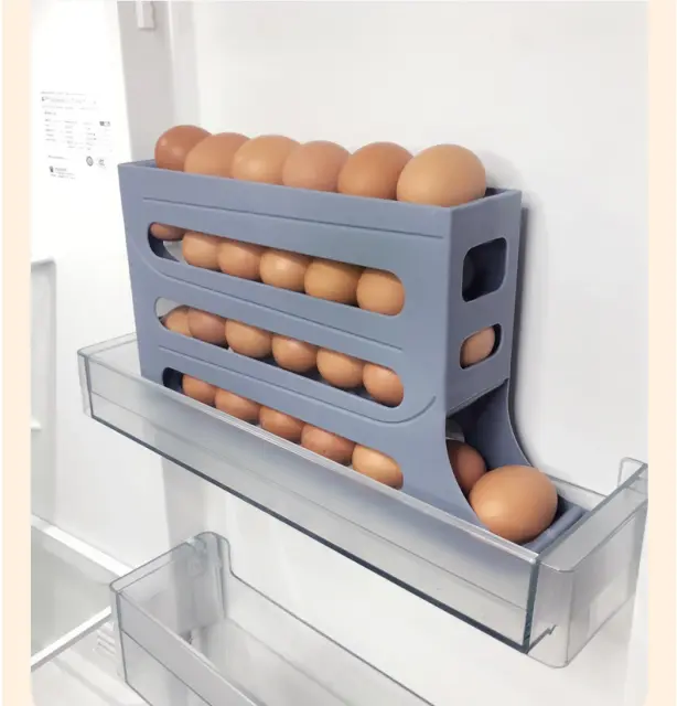 Zasnova s samodejnim kotaljenjem: To držalo za jajca je zasnovano s funkcijo samodejnega kotaljenja, tako da vam ni treba skrbeti, da bi se jajca kotalila ali izgubila v hladilniku. Ko vzamete ven jajce, se ostala samodejno zvrnejo navzdol, kar olajša dostop do naslednjega.