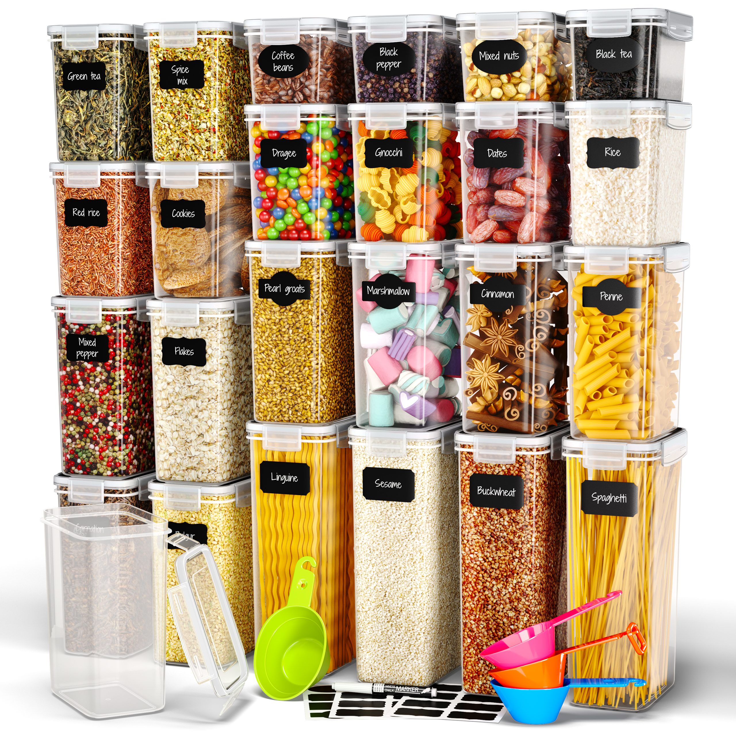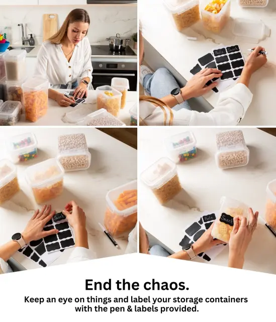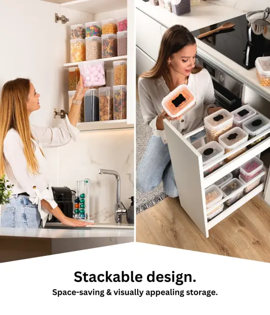Naš komplet je idealen za shranjevanje prigrizkov, kot so sladkarije, granola, oreščki in piškoti, osnovnih živil, kot je moka, in živil za zajtrk, kot je kava. Shranjevanje v teh prozornih posodah je enostavno, živila pa bodo dobro organizirana in vedno pri roki. Nikoli več se vam ne bo zgodilo, da bi pozabili, kam ste nekaj shranili!