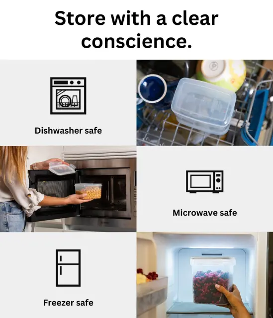 Pri shranjevanju živil in urejanju kuhinje je pomembna praktičnost. Naše plastične posode za večkratno uporabo so varne za uporabo v mikrovalovni pečici (brez pokrovov), zato je pogrevanje hrane enostavno. Brez težav jih lahko postavite tudi v zamrzovalnik.