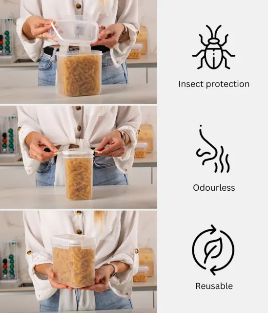 Nič več kaosa v shrambi. Te zložljive posode so odlična rešitev za shranjevanje različnih živil, kot so kosmiči, oreščki, piškoti in testenine.