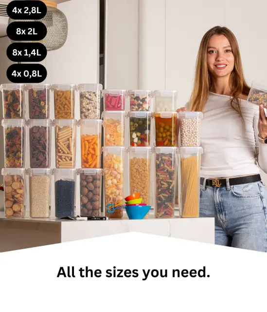 V kompletu dobite kar 24 posod, s prostornino 2,8l, 2 l, 1,4 l in 0,8 l, tako da boste imeli obilo prostora, da organizirate svoja živila!