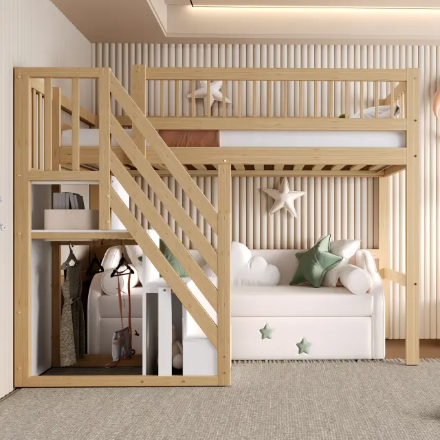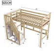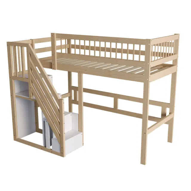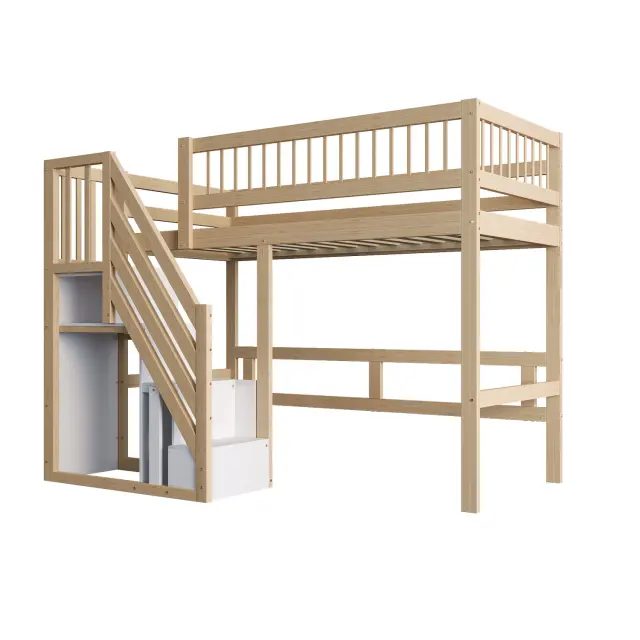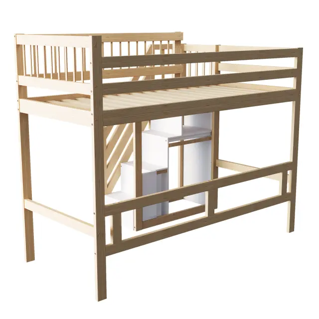 Postelja iz masivnega lesa 90*200 s stopnicami, shrambo in visokim okvirjem, barva lesa