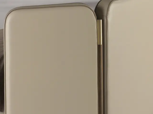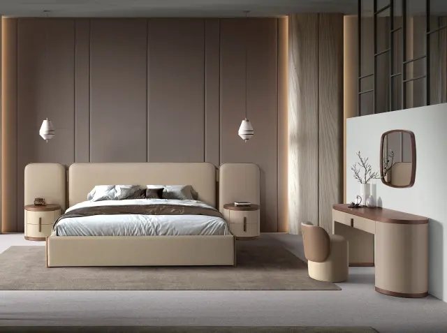 - Njegova spektakularna glava z zložljivimi stranskimi paneli ponuja dodatno udobje in funkcionalnost, ustvarja bolj intimno in sofisticirano okolje, kjer se oblikovanje in dobro počutje popolnoma združita.