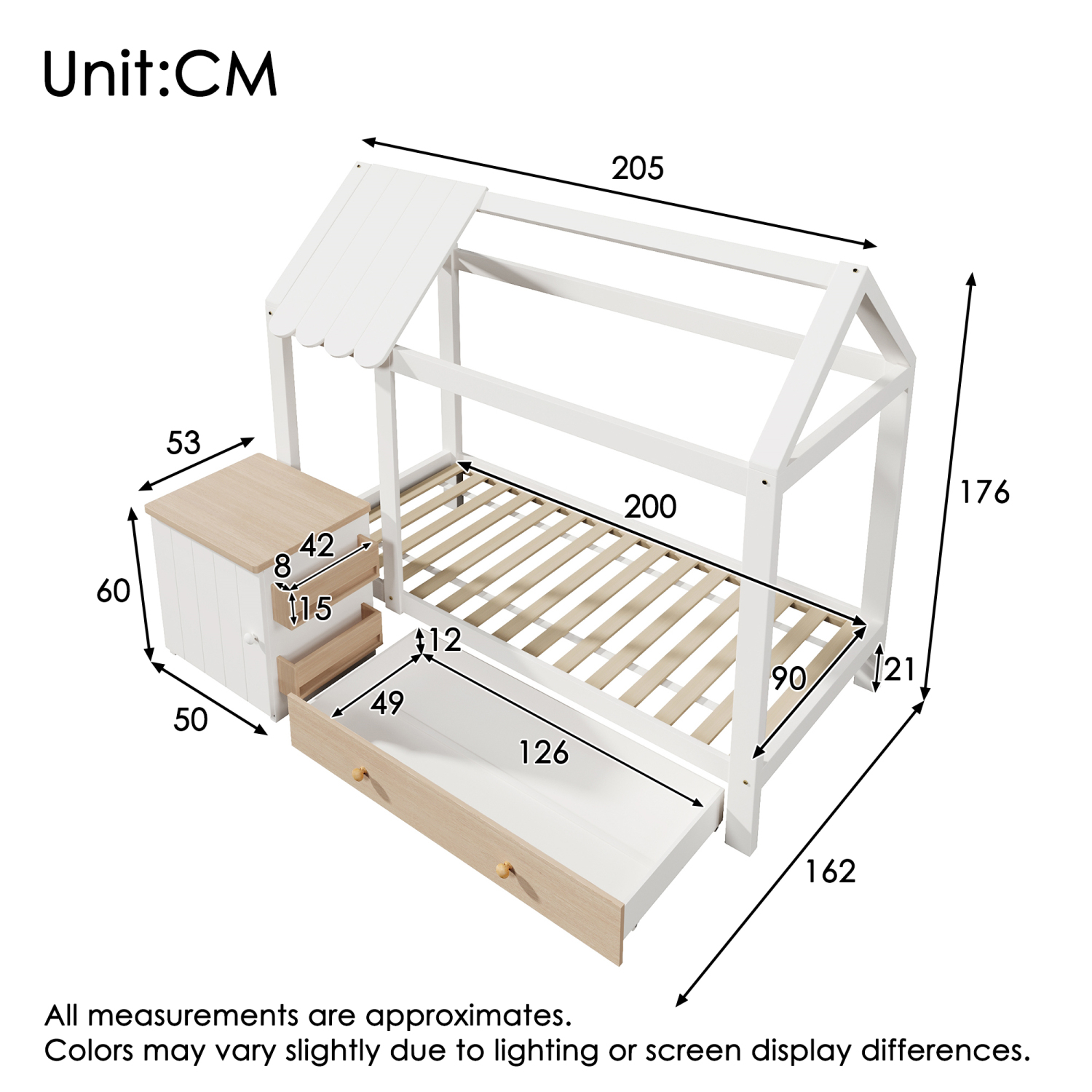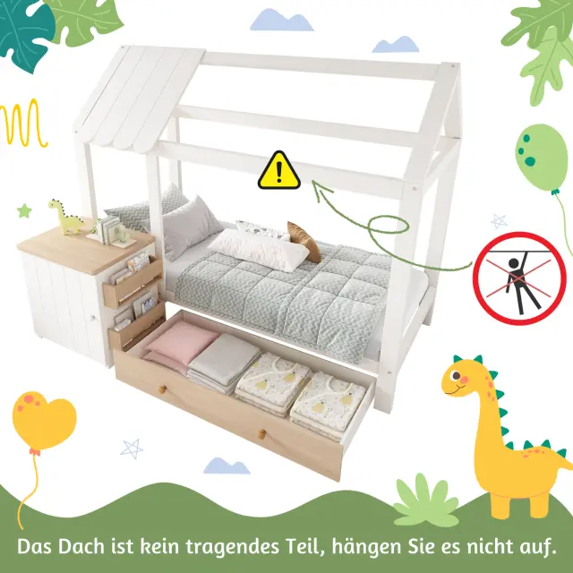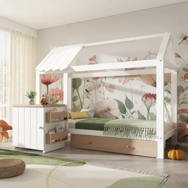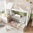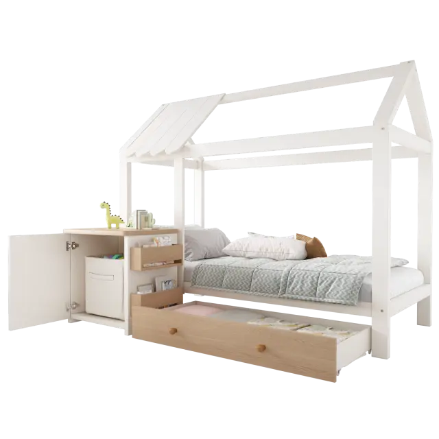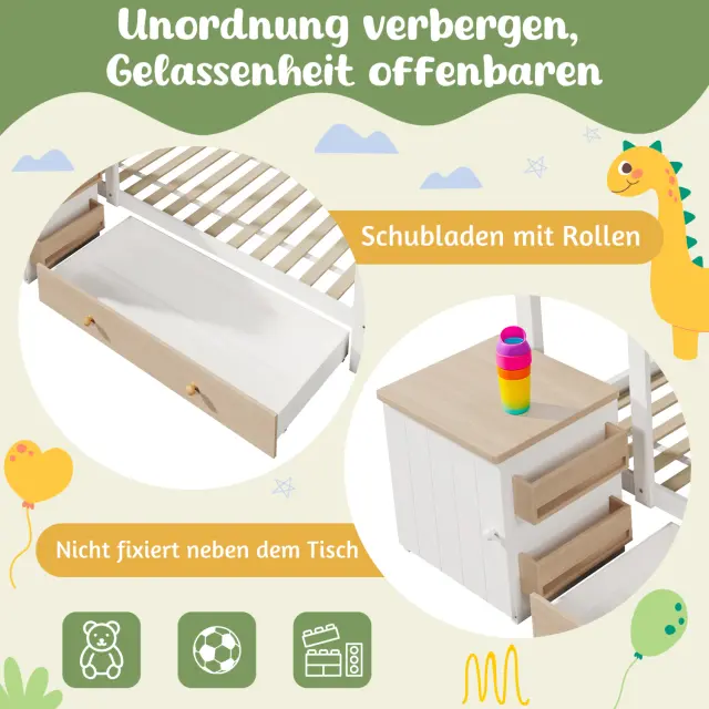 Postelja za hišo, otroška postelja 90x200cm, masiven les s predali in nočno omarico - talna postelja bela/hrast