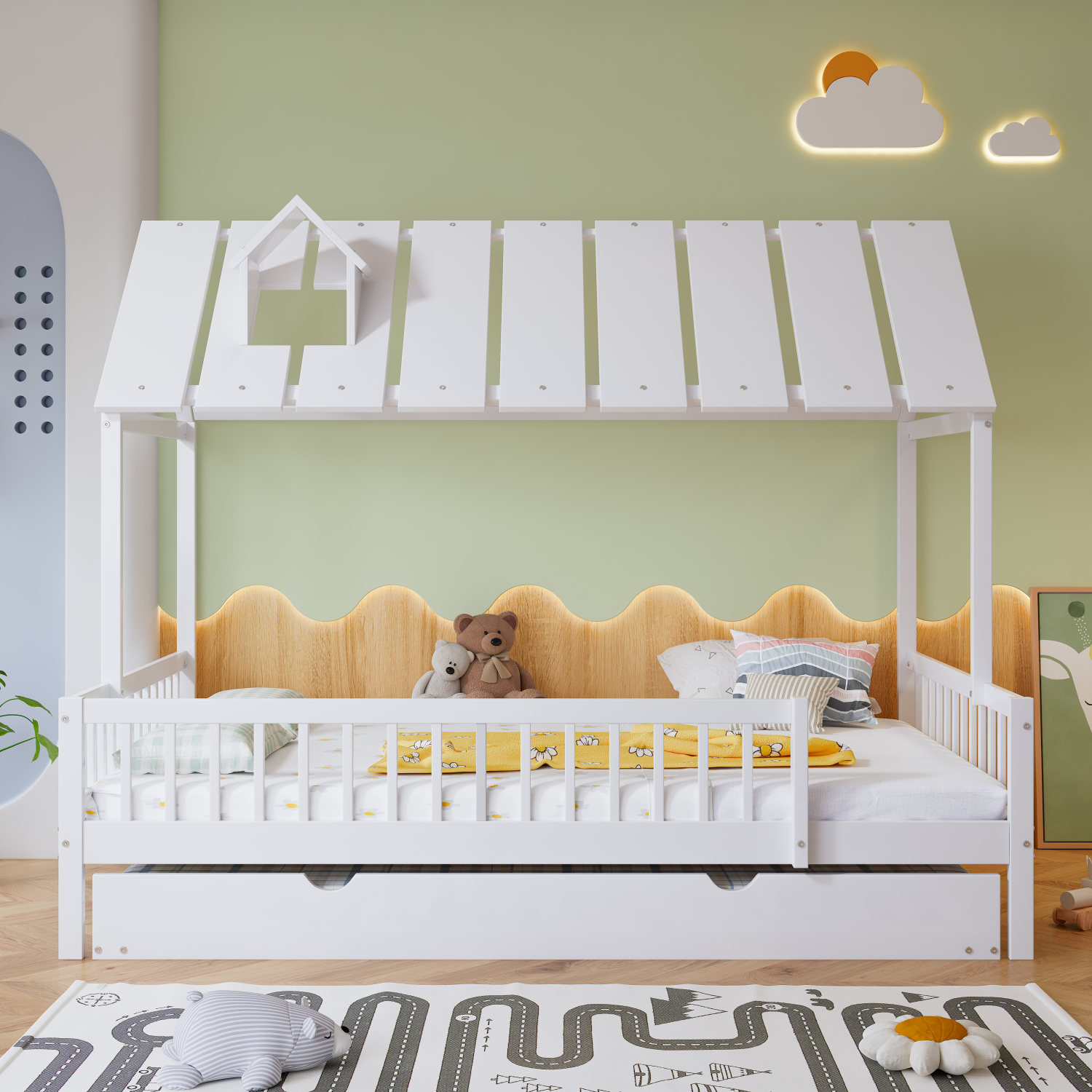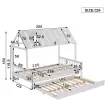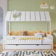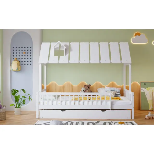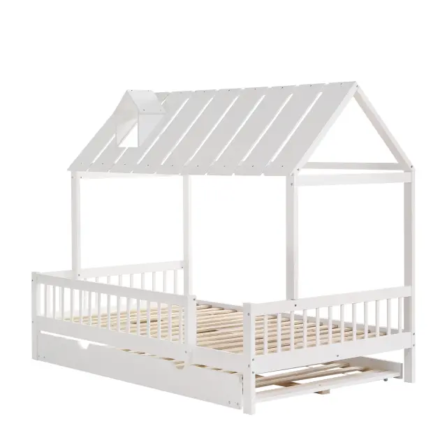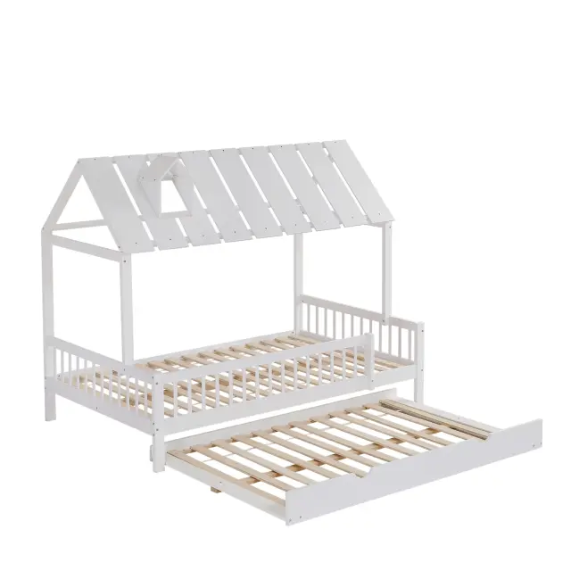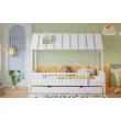 Postelja za hišo z izvlečnim dvižnim delom, streho in dimniško obrobo, otroška/mladostniška postelja, 3-stranske palice, bor/MDF, bela, 120x200/