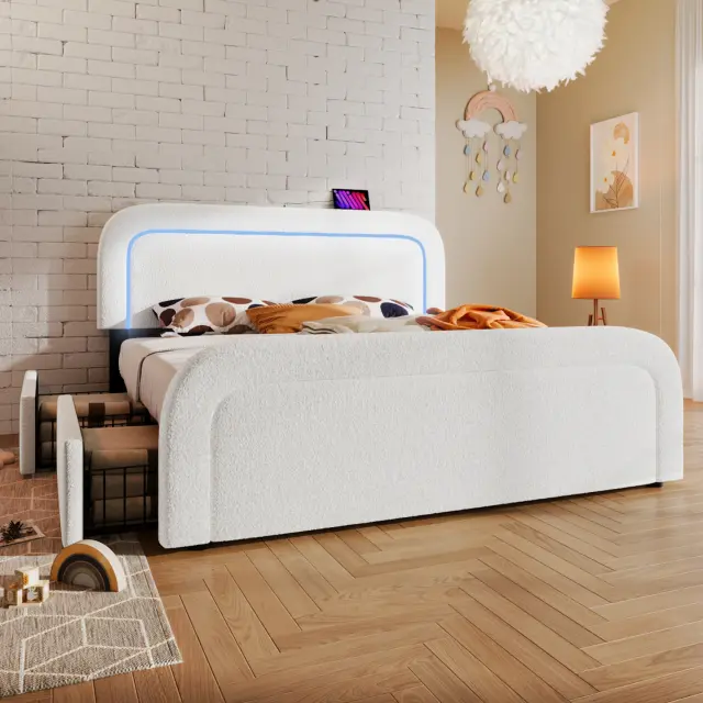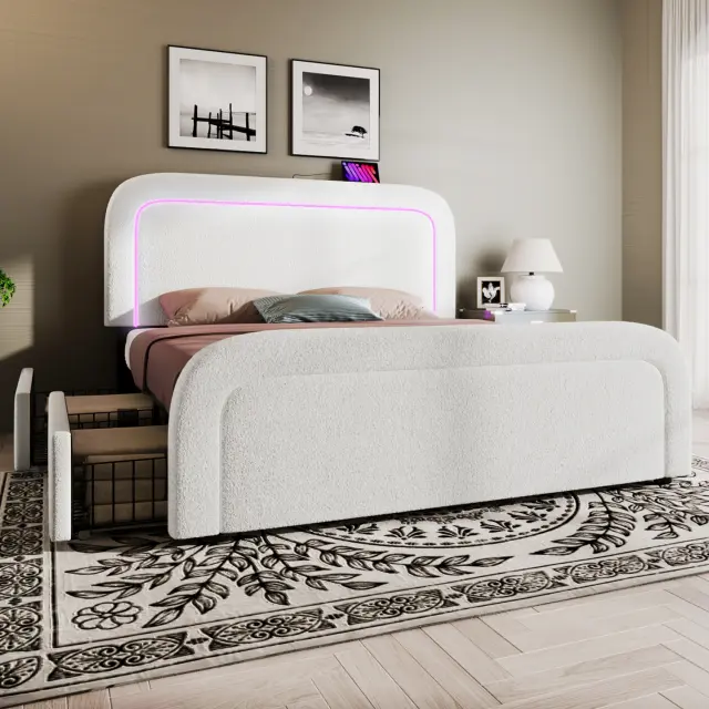 Posteljni okvir 140x200cm Sherp bela z USB-C, LED, 4 predali (z vzmetnico)