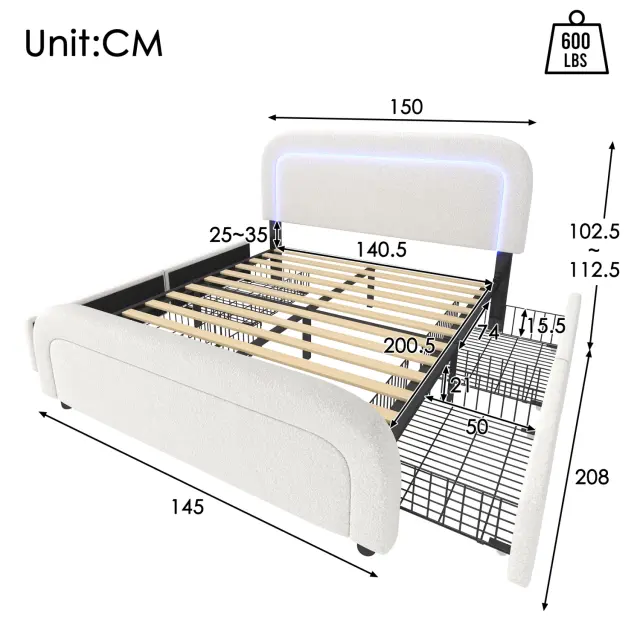 Razkošna postelja Sherpa z USB-C polnilnim priključkom, LED osvetlitvijo in štirimi predali. Vključuje 7-consko vzmetnico iz hladne pene. Enostavna montaža.