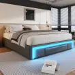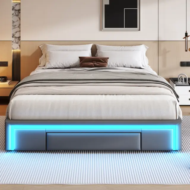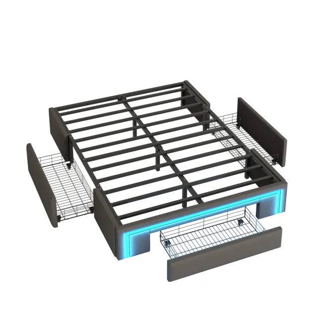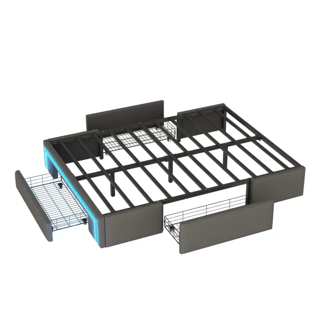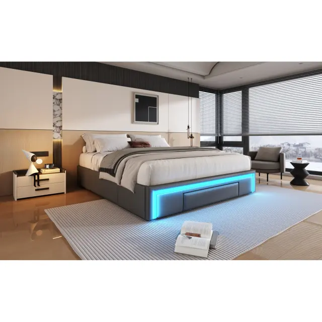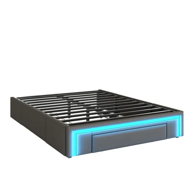 Posteljni okvir 160x200 siv s predali, umetno usnje, brez vzglavja, LED
