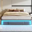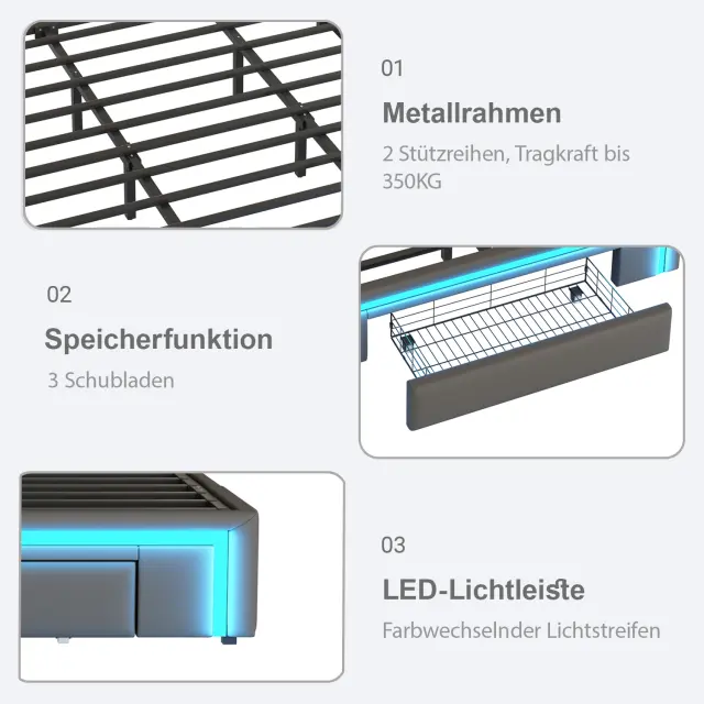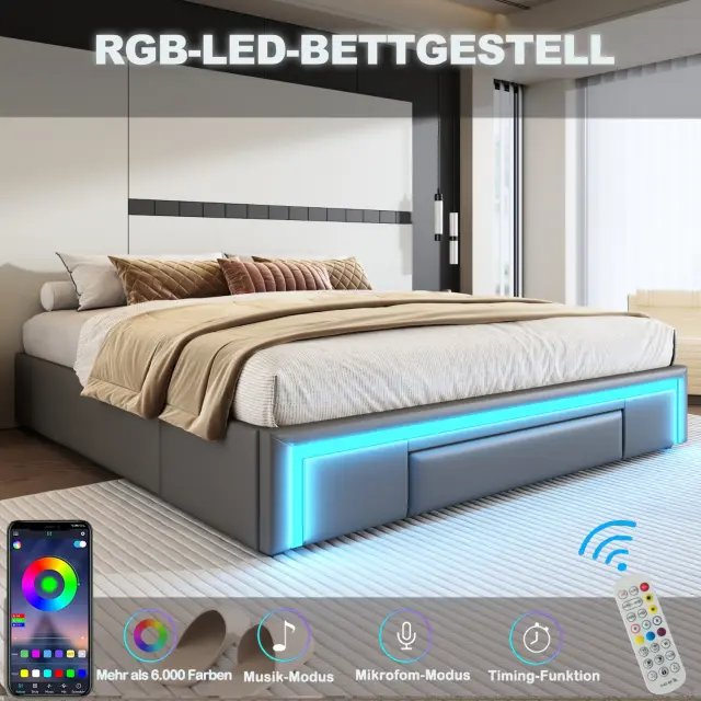 Sodoben posteljni okvir iz umetnega usnja z LED svetlobnim trakom, prostorom za shranjevanje in robustnim kovinskim okvirjem. Možnost prilagoditve z lastnim vzglavjem. Nosilnost do 350 kg.