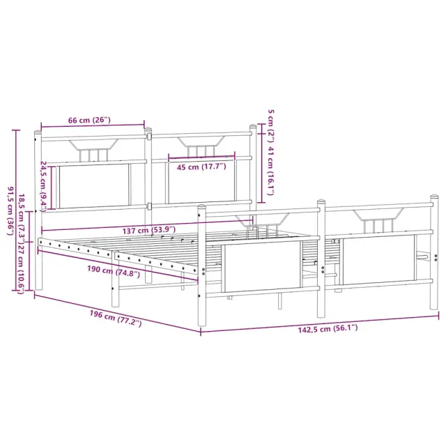 Zagotovite si boljši spanec s tem posteljnim okvirjem! Je prijeten dodatek za vsako spalnico. Stabilen in dolgotrajen okvir: Jeklo je močno, stabilno in trpežno, zato je idealna izbira za številne aplikacije, od proizvodnje pohištva do gradbeništva.Funkcionalno vzglavje in podnožje: Vzglavje in podnožje posteljnega dna ohranjata ležišče na mestu. Poleg tega vzglavje zagotavlja odlično oporo hrbtu, ko sedite v postelji in berete ali gledate televizijo.Dodaten prostor za shranjevanje: Za udobje ima posteljni podstavek pod seboj dodaten prostor, v katerem lahko shranite škatle za shranjevanje, ki niso vidne.Podnožje z letvami za optimalno podporo: Kovinski posteljni okvir je opremljen z letvenim dnom, ki zagotavlja oporo in zračnost ležišča. Dobro je vedeti:Vzmetnica ni priložena tej postelji. Ponujamo različno izbiro ležišč. V naši trgovini si lahko ogledate ustrezne vzmetnice.Barva: Dimljeni hrastMaterial: Inženirski les in jekloCelotne dimenzije: 196 x 142,5 x 91,5 cm (D x Š x V)Višina prostora pod posteljo: 27 cmVelikost primerne vzmetnice: 137 x 190 cm (Š x D) (vzmetnica ni priložena)Z vzglavjem in podnožjemPotrebno sestavljanje: Da
