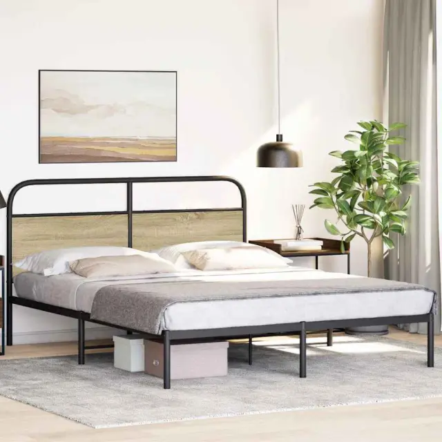 Če iščete trpežen posteljni okvir za svojo spalnico, je ta klasični posteljni okvir z elegantnim in brezčasnim dizajnom popolna izbira!Robustna kovinska konstrukcija: Okvir postelje je izdelan iz jekla. Jeklo je izjemno trd in močan material, ki zagotavlja izjemno trdnost in stabilnost.Stabilne in vzdržljive noge: Ta postelja ima trdne noge, ki zagotavljajo stabilnost, varnost in trdnost.Vsestransko vzglavje: Ta posteljni okvir je opremljen z vzglavjem, ki zagotavlja odlično oporo hrbtu, ko sedite v postelji in berete ali gledate televizijo, hkrati pa služi tudi kot dekorativni element.Podnožje z letvami za optimalno podporo: Za podporo in zračnost ležišča je posteljni okvir opremljen z letvenim dnom.Dobro je vedeti:Vzmetnica ni vključena v to posteljo. Ponujamo različne vzmetnice. V naši trgovini lahko poiščete ustrezno ležišče.Barva: Sonoma hrastMaterial: Jeklo, inženirski lesCelotne dimenzije: 207 x 156 x 100 cm (D x Š x V)Višina prostora pod posteljo: 27 cmVelikost primerne vzmetnice: 150 x 200 cm (Š x D) (vzmetnica ni priložena)Z vzglavjemPotrebno sestavljanje: Da